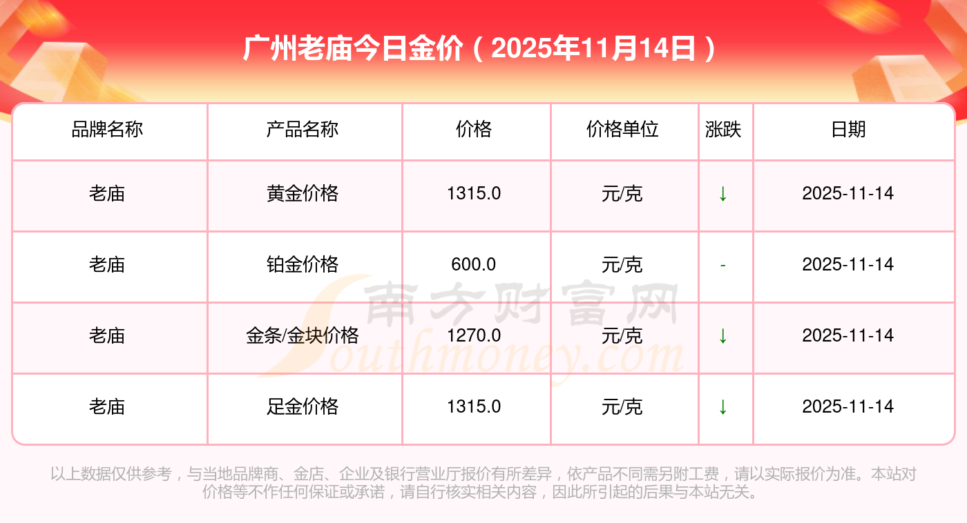 2025年11月14日广州老庙今日价格:黄金价格1333.0元/克,铂金价格646.0元/克,饰品金价(内地)1333.0元/克,黄金饰品(香港)46320.0,铂金价格(香港)18410.0,金条价格(香港)41780.0,金条金价(内地)1167.0元/克,黄金价格1322.0元/克,铂金价格600.0元/克,足金价格1322.0元/克,黄金价格1295.0元/克。