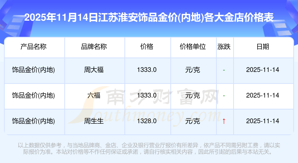 江苏淮安饰品金价(内地)最高的金店是周大福,报价1333.0元/克,最低的是周生生,报价1328.0元/克。今日饰品金价(内地)高低差为5元/克。