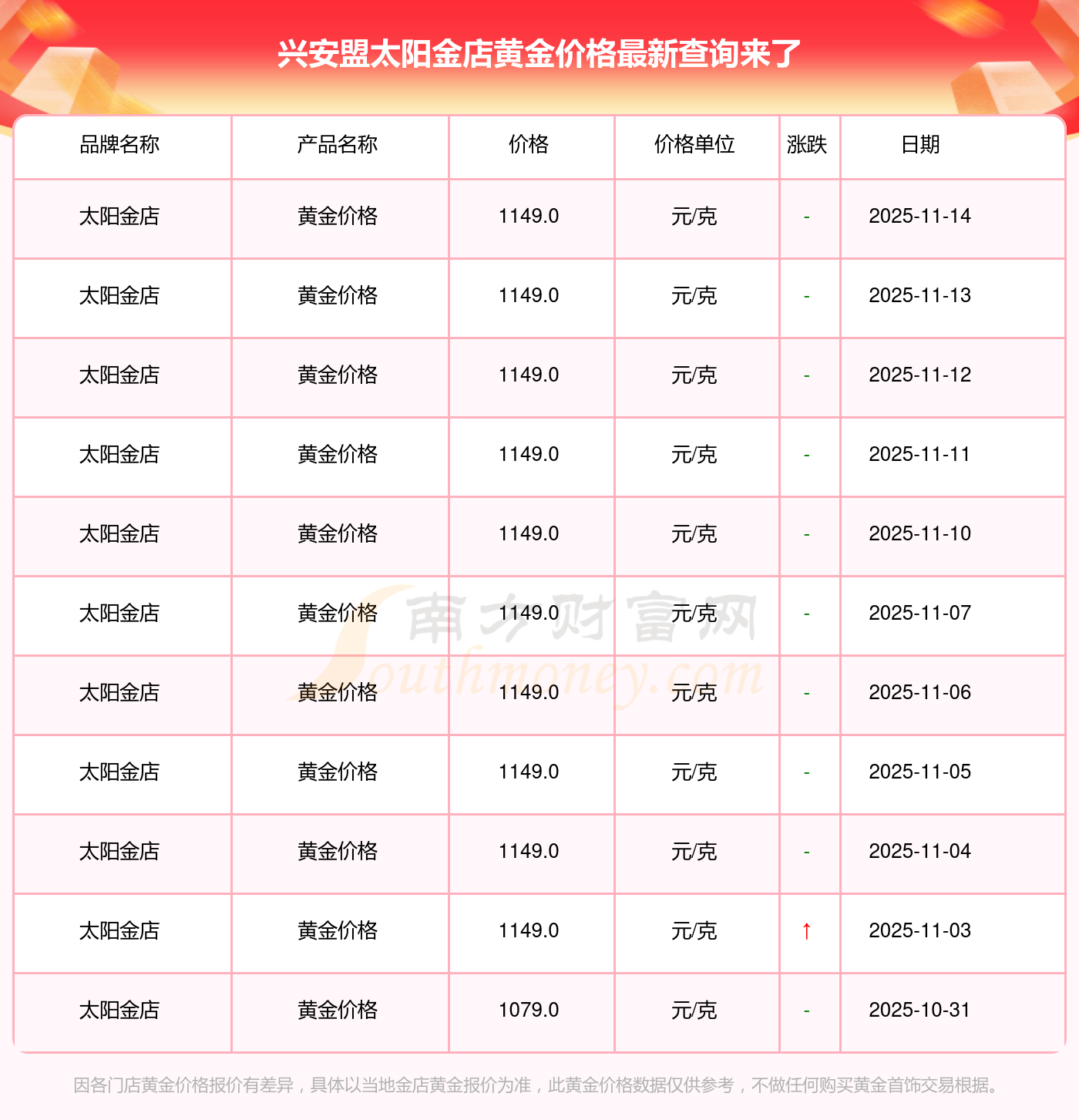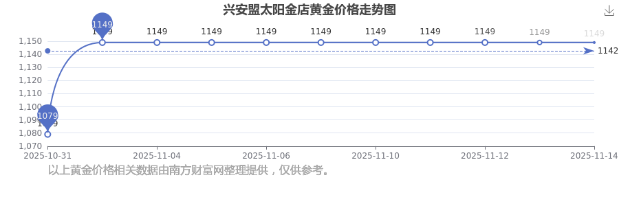 2025年11月14日当天,兴安盟太阳金店黄金价格的单价是 1149.0元/克。