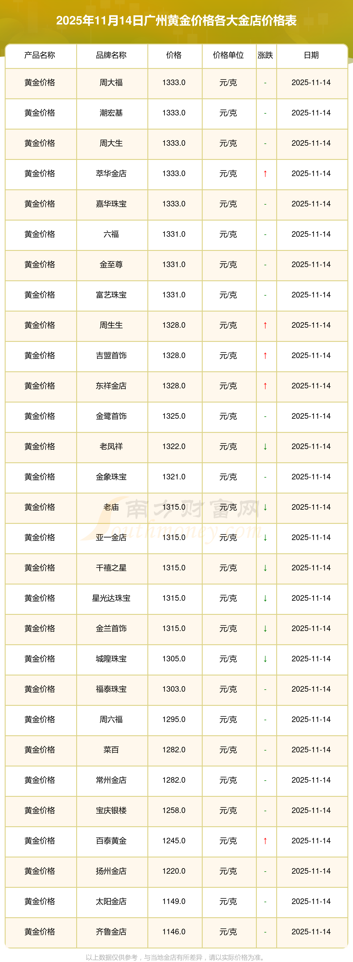 今天是2025年11月14日,广州周大福、周大福、周大福、周大福、周大福、周大福、周大福、老凤祥、老凤祥、老凤祥、周六福等各大金店品牌黄金价格最新价格如下:周大福1333.0元/克、周大福646.0元/克、周大福1333.0元/克、周大福46320.0、周大福18410.0、周大福41780.0、周大福1167.0元/克、老凤祥1322.0元/克、老凤祥600.0元/克、老凤祥1322.0元/克、周六福1295.0元/克。