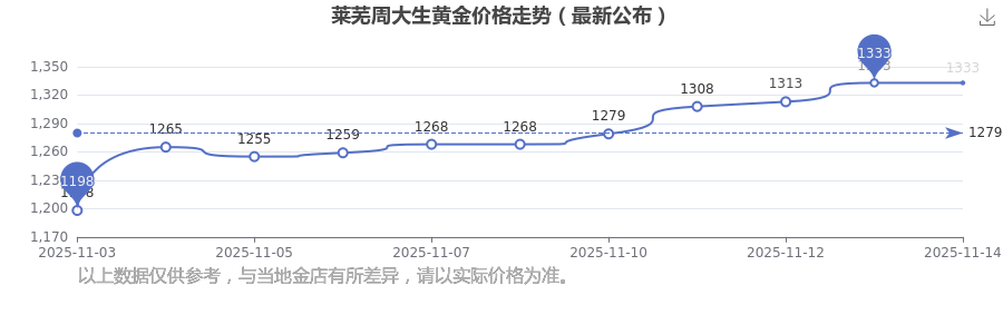 今日(2025年11月14日)莱芜周大生黄金价格为1333.0元/克。