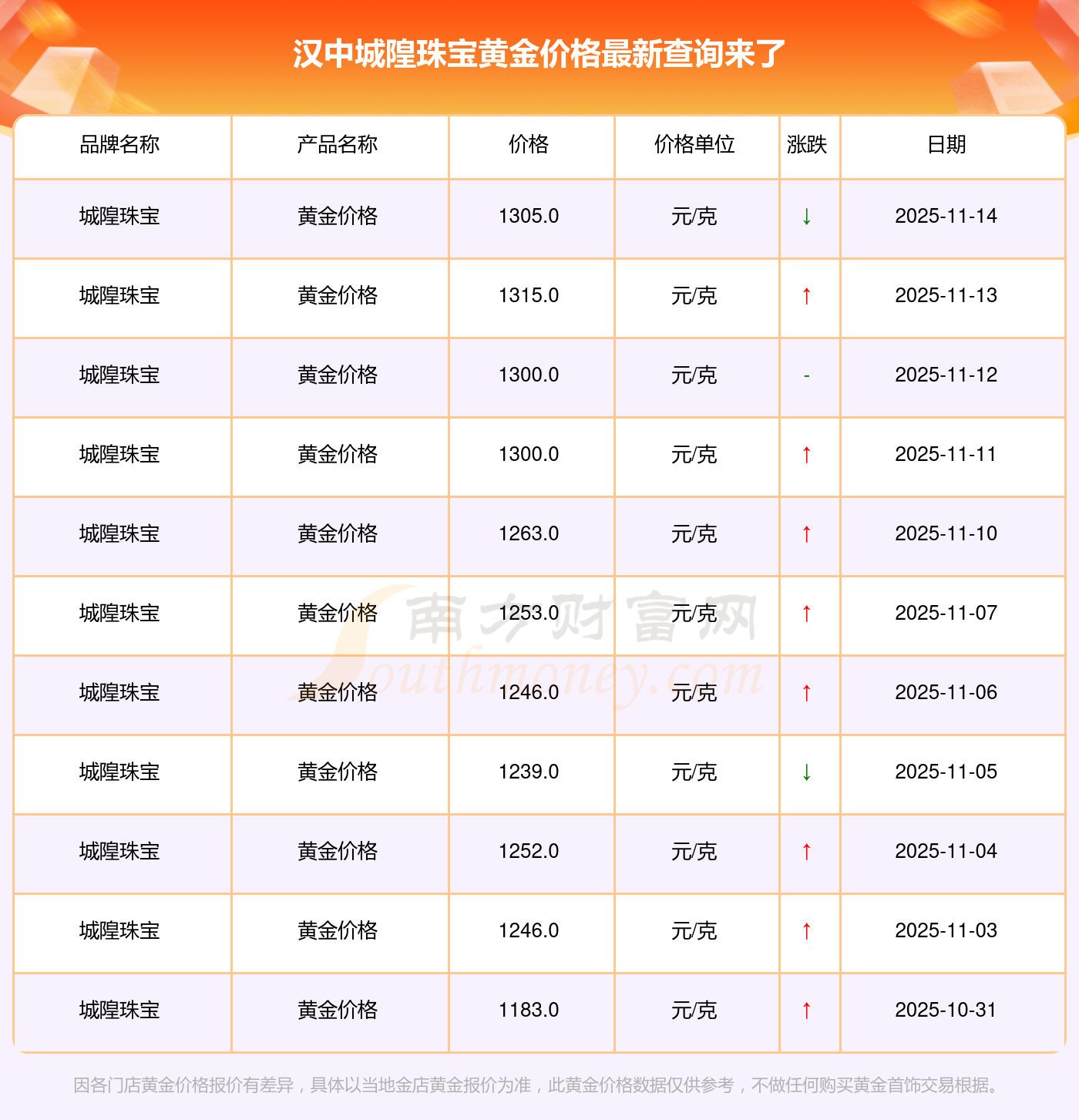 2025年11月14日这一天,汉中城隍珠宝的黄金价格以 1305.0元/克的价格售卖。