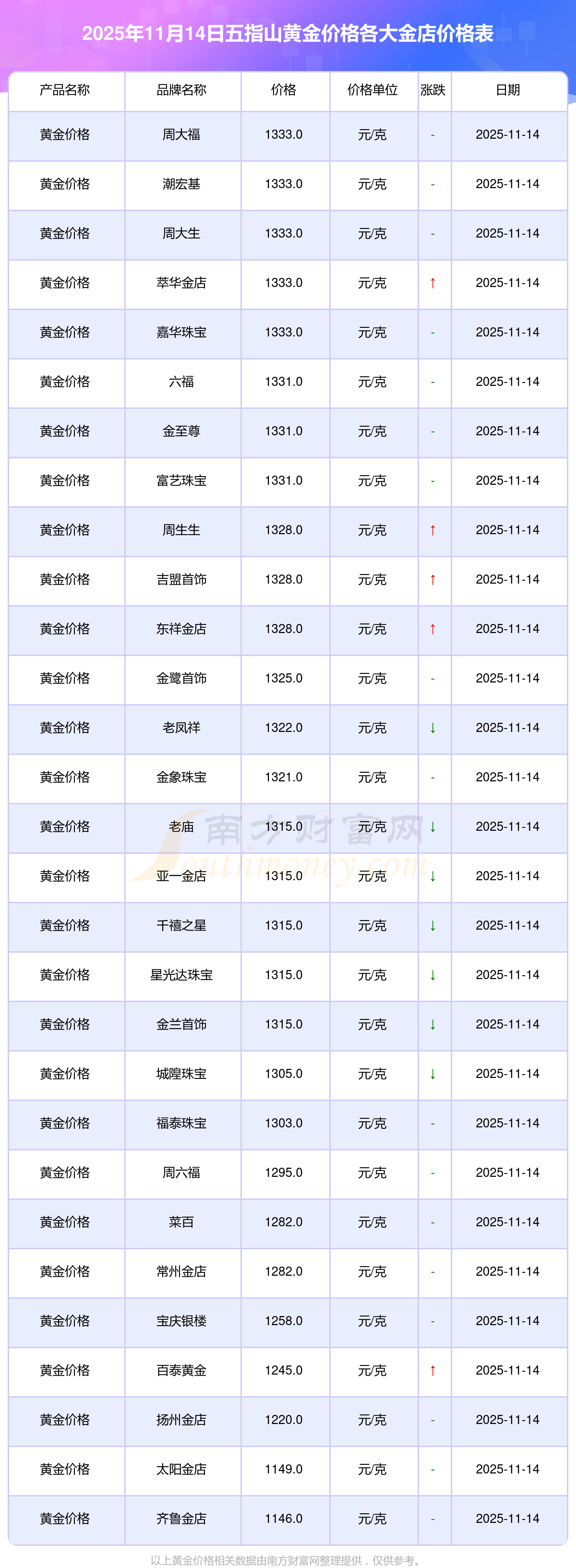 2025年11月14日五指山各大金店黄金价格最新价格:周大福1333.0元/克,周大福646.0元/克,周大福1333.0元/克,周大福46320.0,周大福18410.0,周大福41780.0,周大福1167.0元/克,老凤祥1322.0元/克,老凤祥600.0元/克,老凤祥1322.0元/克,周六福1295.0元/克。
