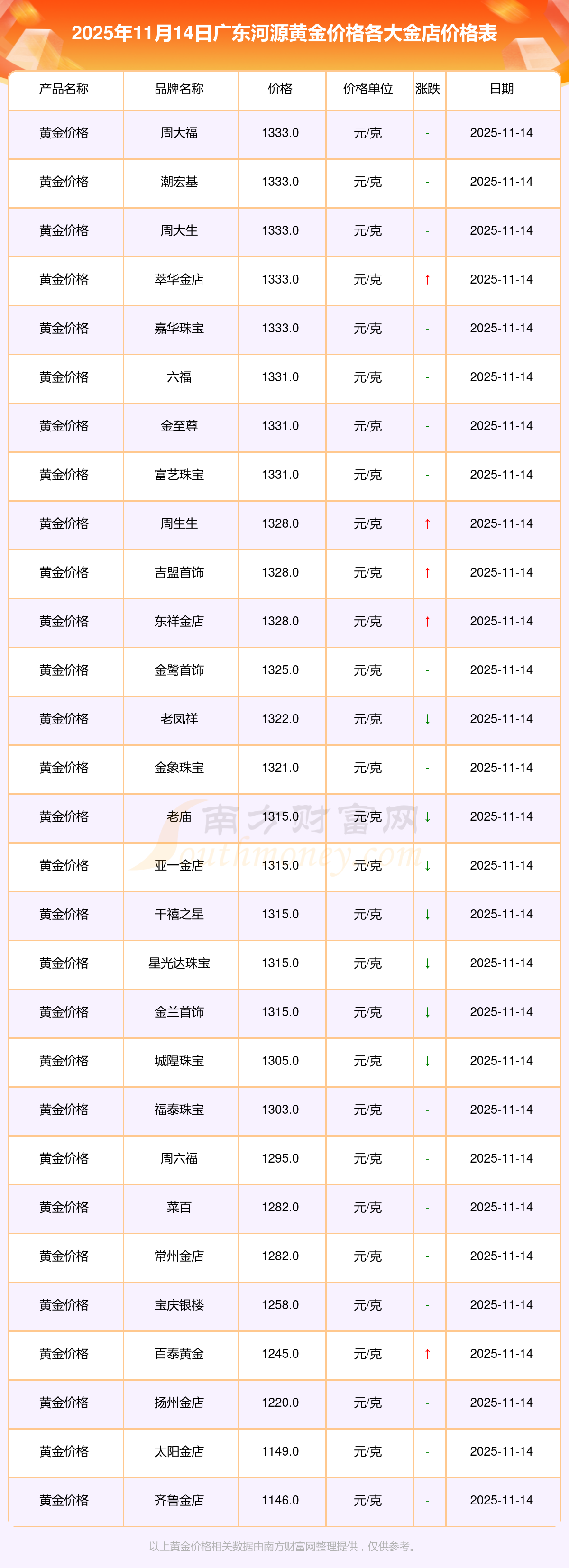 2025年11月14日,广东河源周大福、周大福、周大福、周大福、周大福、周大福、周大福、老凤祥、老凤祥、老凤祥、周六福等各大金店品牌黄金价格今日价格行情最新来了:周大福1333.0元/克、周大福646.0元/克、周大福1333.0元/克、周大福46320.0、周大福18410.0、周大福41780.0、周大福1167.0元/克、老凤祥1322.0元/克、老凤祥600.0元/克、老凤祥1322.0元/克、周六福1295.0元/克。