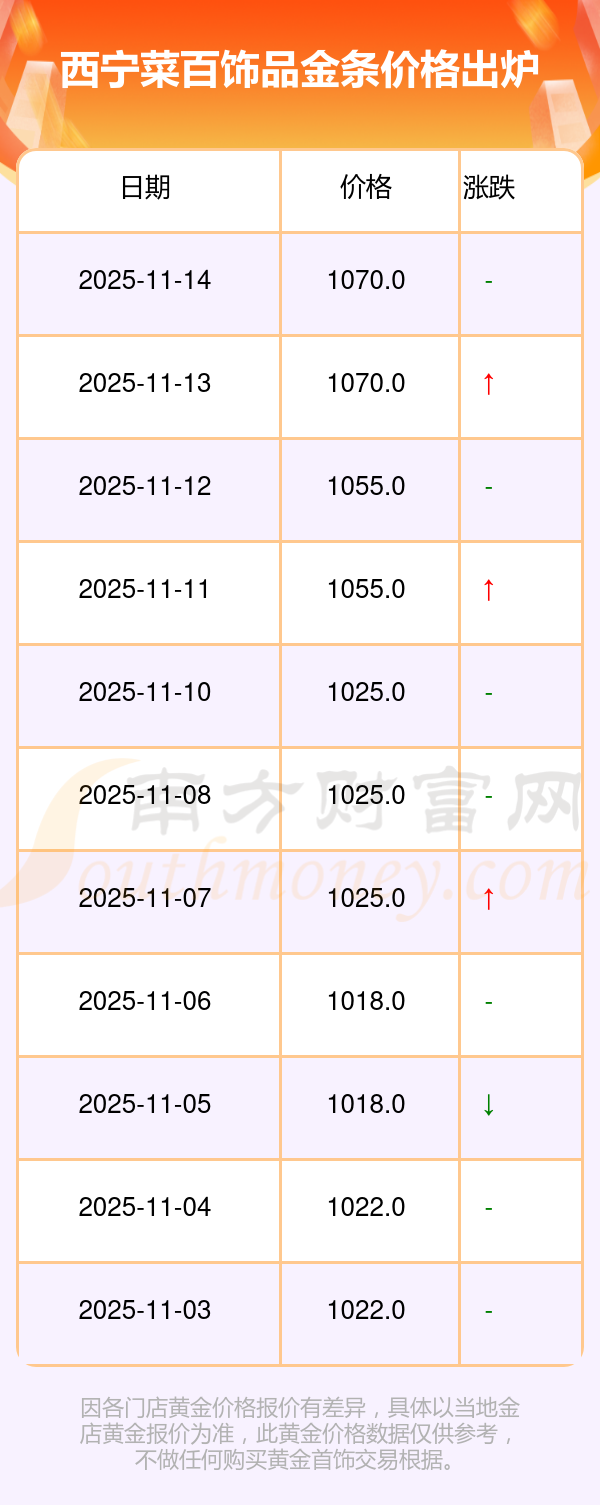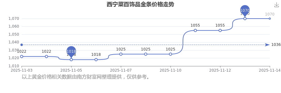 今日(2025年11月14日),西宁菜百饰品金条价格的价格是1070.0元/克。