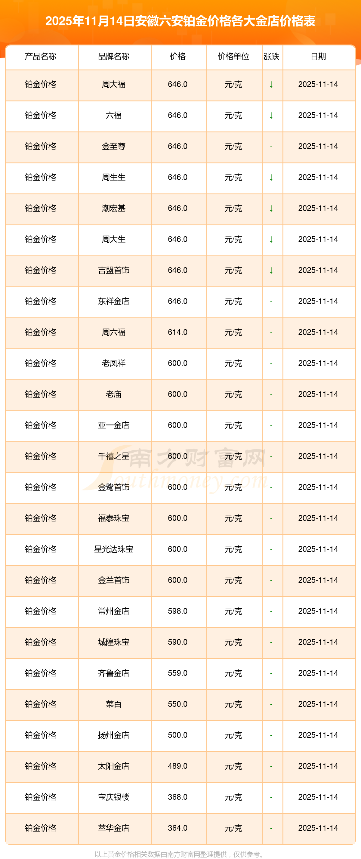2025年11月14日,安徽六安周大福、周大福、周大福、周大福、周大福、周大福、周大福、老凤祥、老凤祥、老凤祥、周六福等各大金店品牌铂金价格今日价格行情最新来了:周大福1333.0元/克、周大福646.0元/克、周大福1333.0元/克、周大福46320.0、周大福18410.0、周大福41780.0、周大福1167.0元/克、老凤祥1322.0元/克、老凤祥600.0元/克、老凤祥1322.0元/克、周六福1295.0元/克。