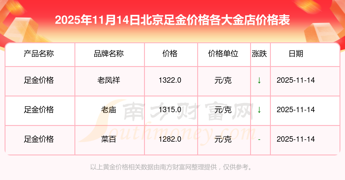 2025年11月14日,北京周大福、周大福、周大福、周大福、周大福、周大福、周大福、老凤祥、老凤祥、老凤祥、周六福等各大金店品牌足金价格今日价格行情最新来了:周大福1333.0元/克、周大福646.0元/克、周大福1333.0元/克、周大福46320.0、周大福18410.0、周大福41780.0、周大福1167.0元/克、老凤祥1322.0元/克、老凤祥600.0元/克、老凤祥1322.0元/克、周六福1295.0元/克。