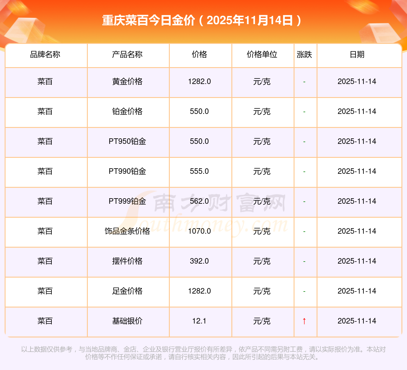 2025年11月14日重庆菜百每克黄金的市场价格是多少:黄金价格1333.0元/克,铂金价格646.0元/克,饰品金价(内地)1333.0元/克,黄金饰品(香港)46320.0,铂金价格(香港)18410.0,金条价格(香港)41780.0,金条金价(内地)1167.0元/克,黄金价格1322.0元/克,铂金价格600.0元/克,足金价格1322.0元/克,黄金价格1295.0元/克。