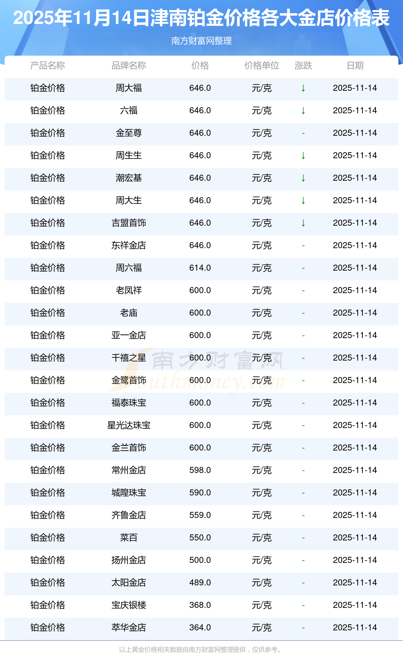 今天是2025年11月14日,津南周大福、周大福、周大福、周大福、周大福、周大福、周大福、老凤祥、老凤祥、老凤祥、周六福等各大金店品牌铂金价格最新价格行情是这样的:周大福1333.0元/克、周大福646.0元/克、周大福1333.0元/克、周大福46320.0、周大福18410.0、周大福41780.0、周大福1167.0元/克、老凤祥1322.0元/克、老凤祥600.0元/克、老凤祥1322.0元/克、周六福1295.0元/克。