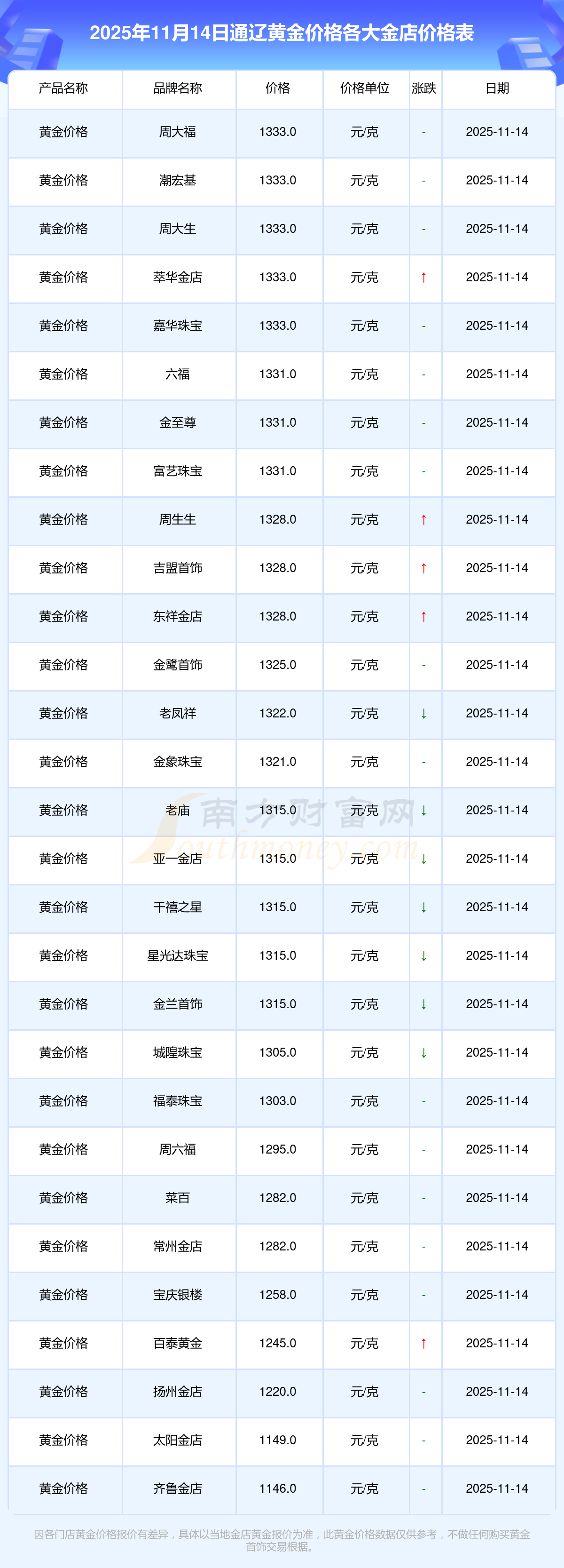 一、2025年11月14日通辽各大金店黄金价格最新价格:周大福1333.0元/克,周大福646.0元/克,周大福1333.0元/克,周大福46320.0,周大福18410.0,周大福41780.0,周大福1167.0元/克,老凤祥1322.0元/克,老凤祥600.0元/克,老凤祥1322.0元/克,周六福1295.0元/克。