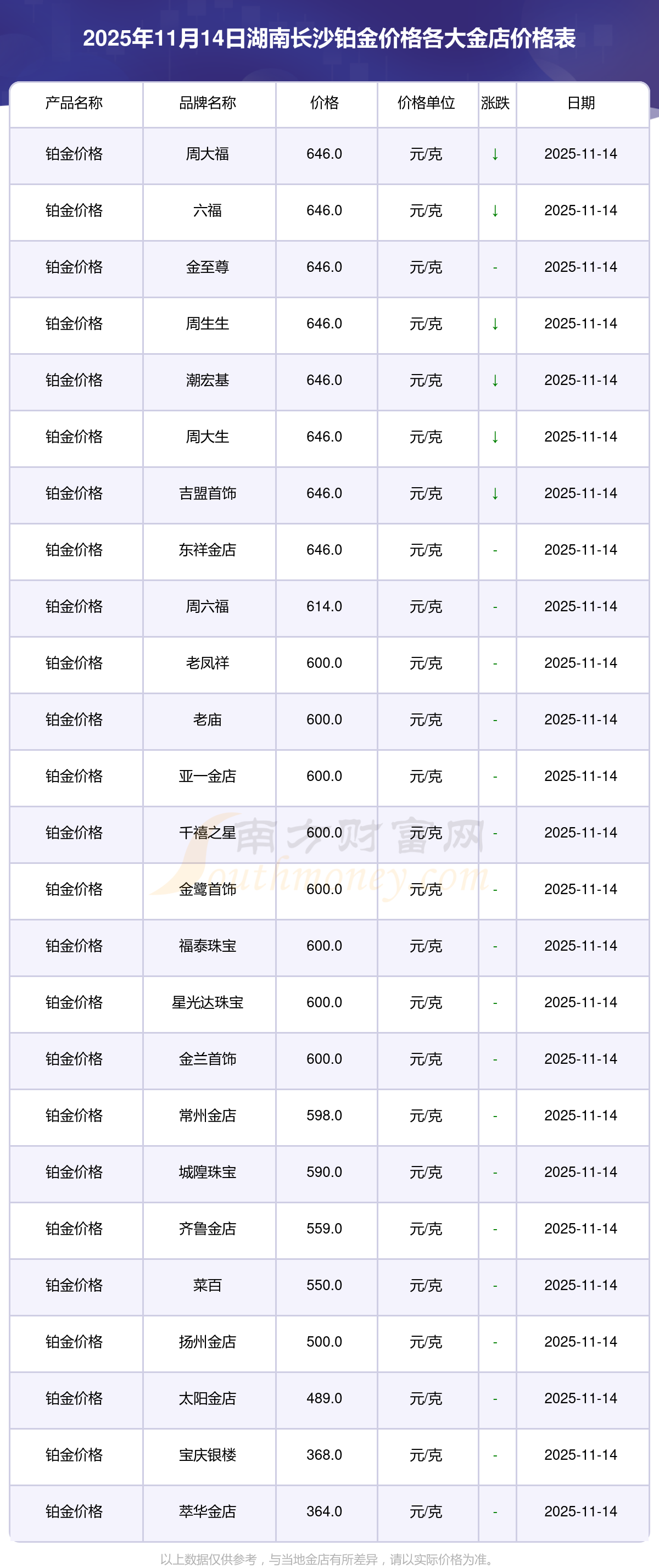 2025年11月14日湖南长沙周大福、周大福、周大福、周大福、周大福、周大福、周大福、老凤祥、老凤祥、老凤祥、周六福等各大金店品牌铂金价格最新价格如下:周大福黄金价格1333.0元/克,周大福铂金价格646.0元/克,周大福饰品金价(内地)1333.0元/克,周大福黄金饰品(香港)46320.0,周大福铂金价格(香港)18410.0,周大福金条价格(香港)41780.0,周大福金条金价(内地)1167.0元/克,老凤祥黄金价格1322.0元/克,老凤祥铂金价格600.0元/克,老凤祥足金价格1322.0元/克,周六福黄金价格1295.0元/克。