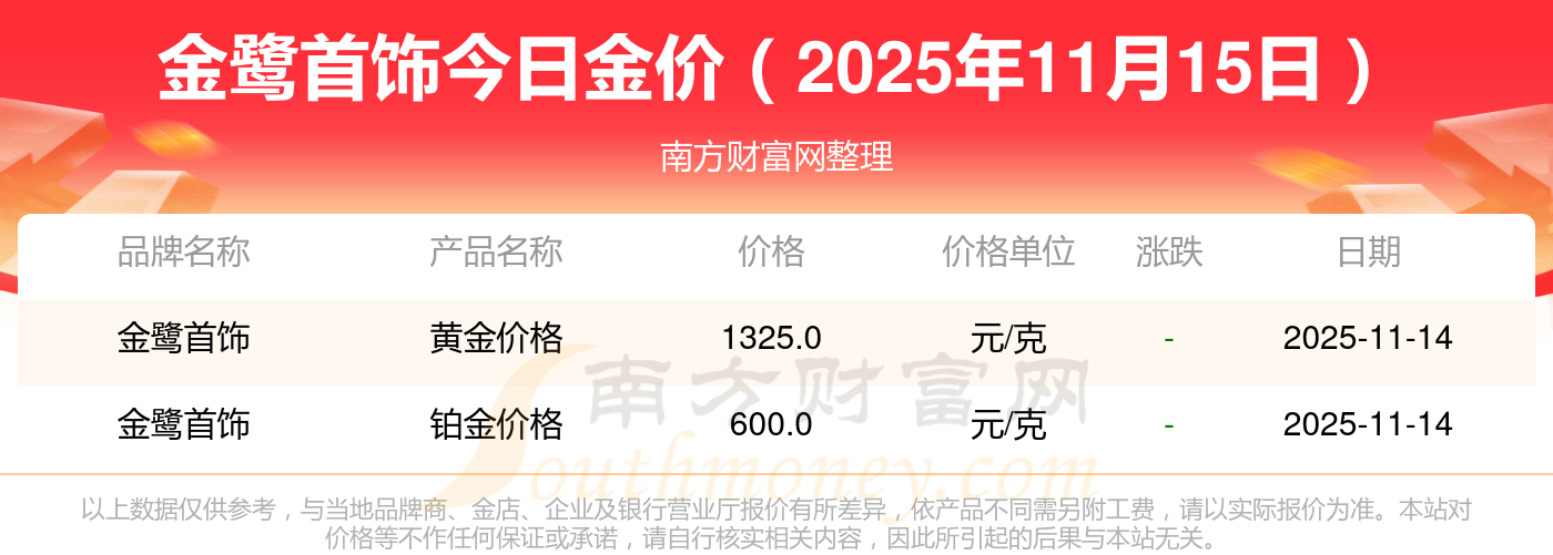 黄金价格1333.0元/克,铂金价格646.0元/克,饰品金价(内地)1333.0元/克,黄金饰品(香港)46320.0,铂金价格(香港)18410.0,金条价格(香港)41780.0,金条金价(内地)1167.0元/克,黄金价格1322.0元/克,铂金价格600.0元/克,足金价格1322.0元/克,黄金价格1295.0元/克。