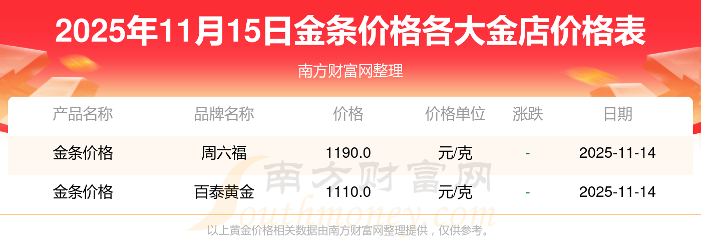 今天是2025年11月15日,周大福、周大福、周大福、周大福、周大福、周大福、周大福、老凤祥、老凤祥、老凤祥、周六福等各大金店品牌金条价格最新价格如下:周大福1333.0元/克、周大福646.0元/克、周大福1333.0元/克、周大福46320.0、周大福18410.0、周大福41780.0、周大福1167.0元/克、老凤祥1322.0元/克、老凤祥600.0元/克、老凤祥1322.0元/克、周六福1295.0元/克。