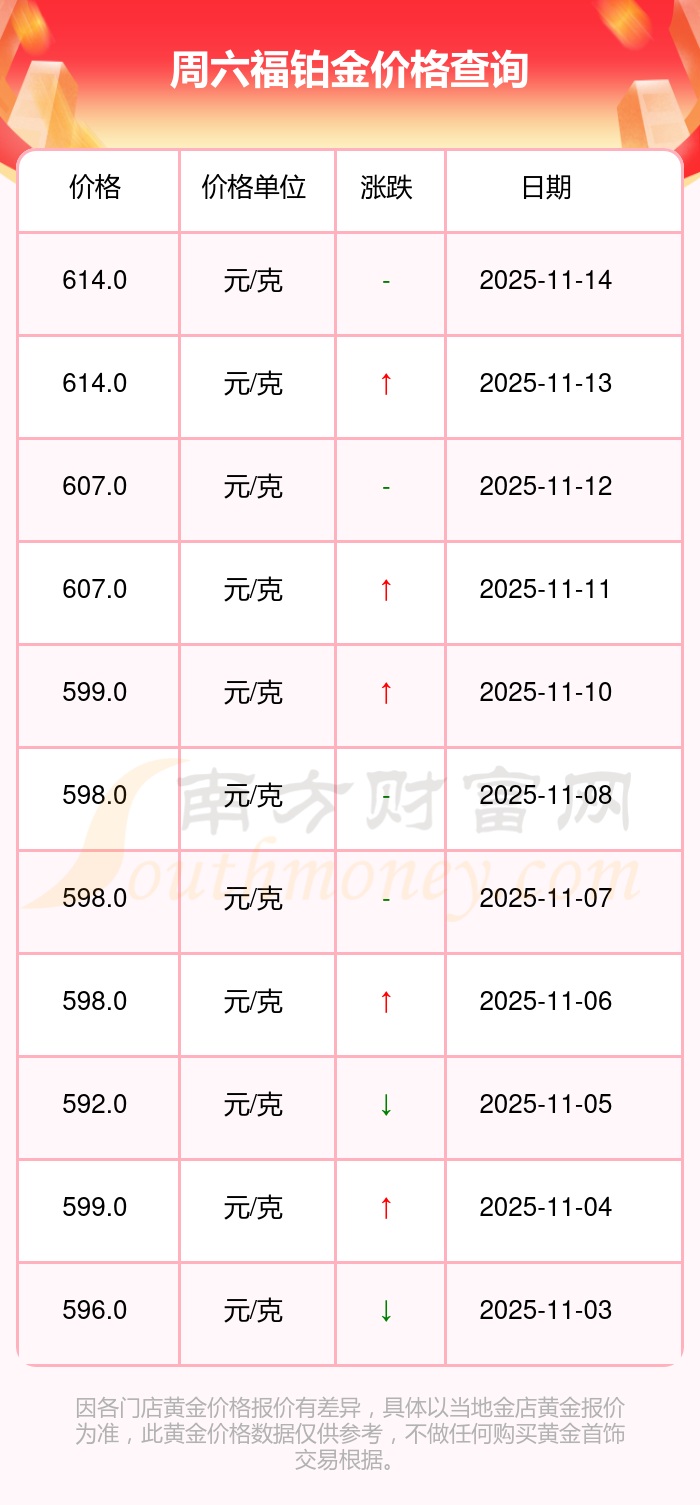 今日(2025年11月15日)周六福铂金价格为614.0元/克。