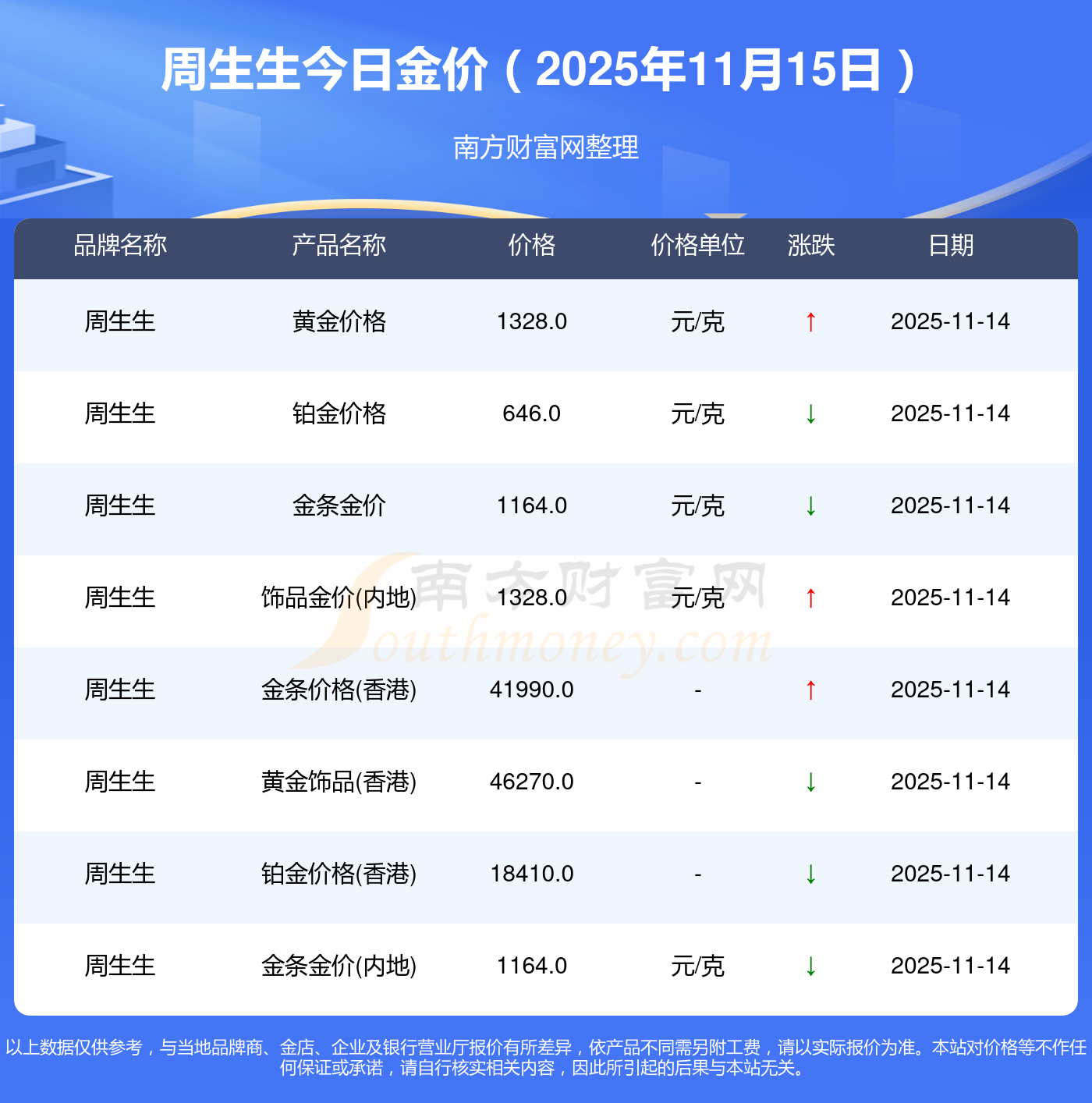 2025年11月15日,周大福、周大福、周大福、周大福、周大福、周大福、周大福、老凤祥、老凤祥、老凤祥、周六福等各大金店品牌饰品金价(内地)今日价格如下:周大福1333.0元/克、周大福646.0元/克、周大福1333.0元/克、周大福46320.0、周大福18410.0、周大福41780.0、周大福1167.0元/克、老凤祥1322.0元/克、老凤祥600.0元/克、老凤祥1322.0元/克、周六福1295.0元/克。