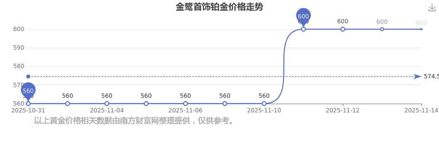 今日(2025年11月15日),金鹭首饰铂金价格:600.0元/克。