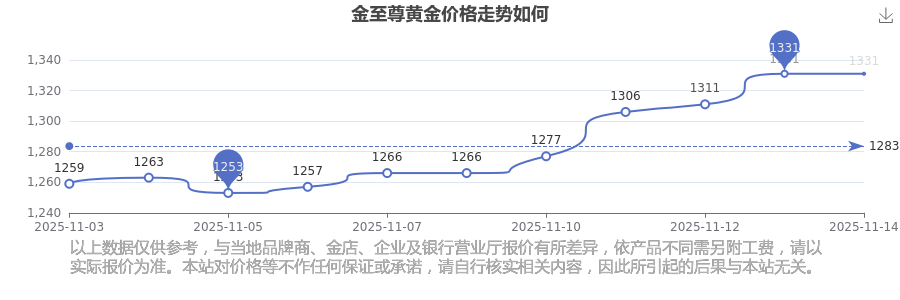 2025年11月15日金至尊黄金价格查询:1331.0元/克。