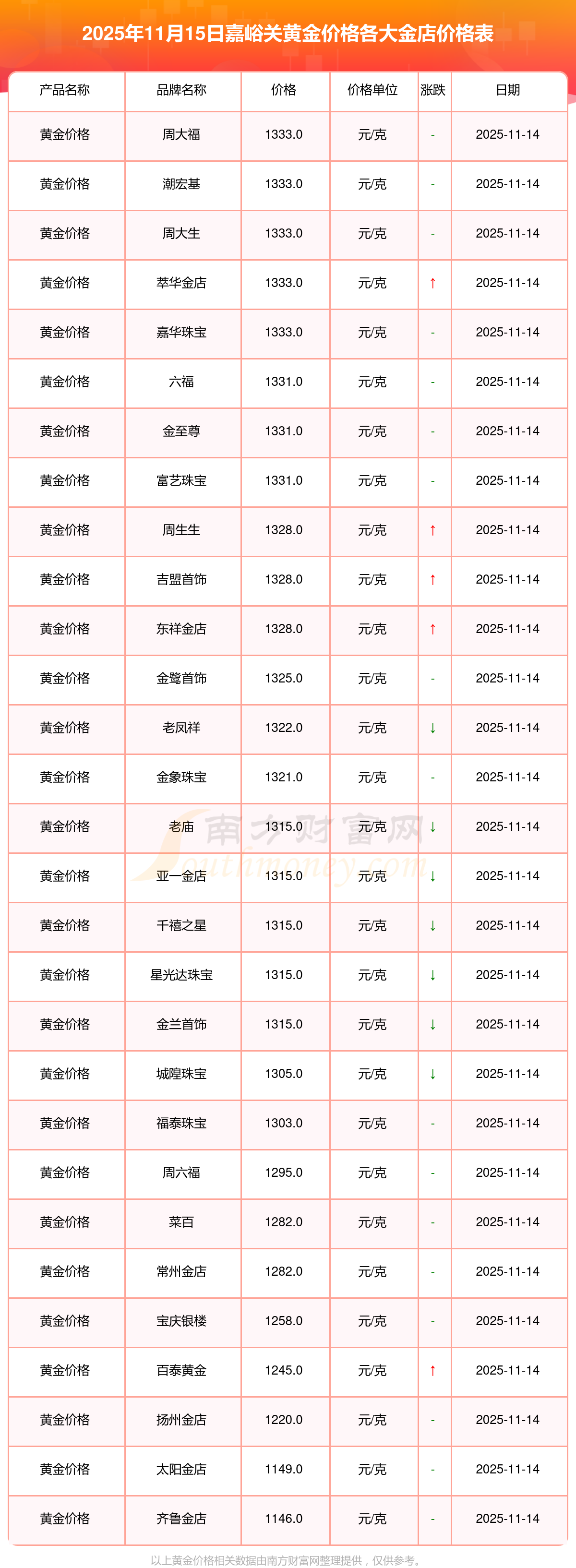 2025年11月15日,嘉峪关周大福、周大福、周大福、周大福、周大福、周大福、周大福、老凤祥、老凤祥、老凤祥、周六福等各大金店品牌黄金价格今日价格行情最新来了:周大福1333.0元/克、周大福646.0元/克、周大福1333.0元/克、周大福46320.0、周大福18410.0、周大福41780.0、周大福1167.0元/克、老凤祥1322.0元/克、老凤祥600.0元/克、老凤祥1322.0元/克、周六福1295.0元/克。