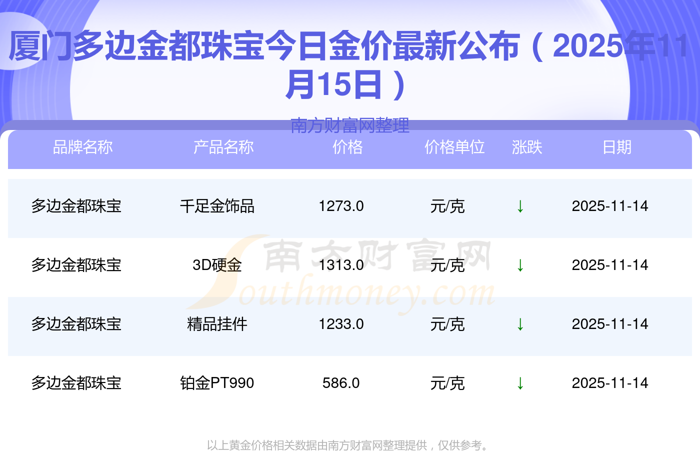 今日黄金价格是怎样的?当下黄金一克要卖多少钱?2025年11月15日厦门多边金都珠宝一克黄金对应的价格是多少?黄金价格1333.0元/克,铂金价格646.0元/克,饰品金价(内地)1333.0元/克,黄金饰品(香港)46320.0,铂金价格(香港)18410.0,金条价格(香港)41780.0,金条金价(内地)1167.0元/克,黄金价格1322.0元/克,铂金价格600.0元/克,足金价格1322.0元/克,黄金价格1295.0元/克。