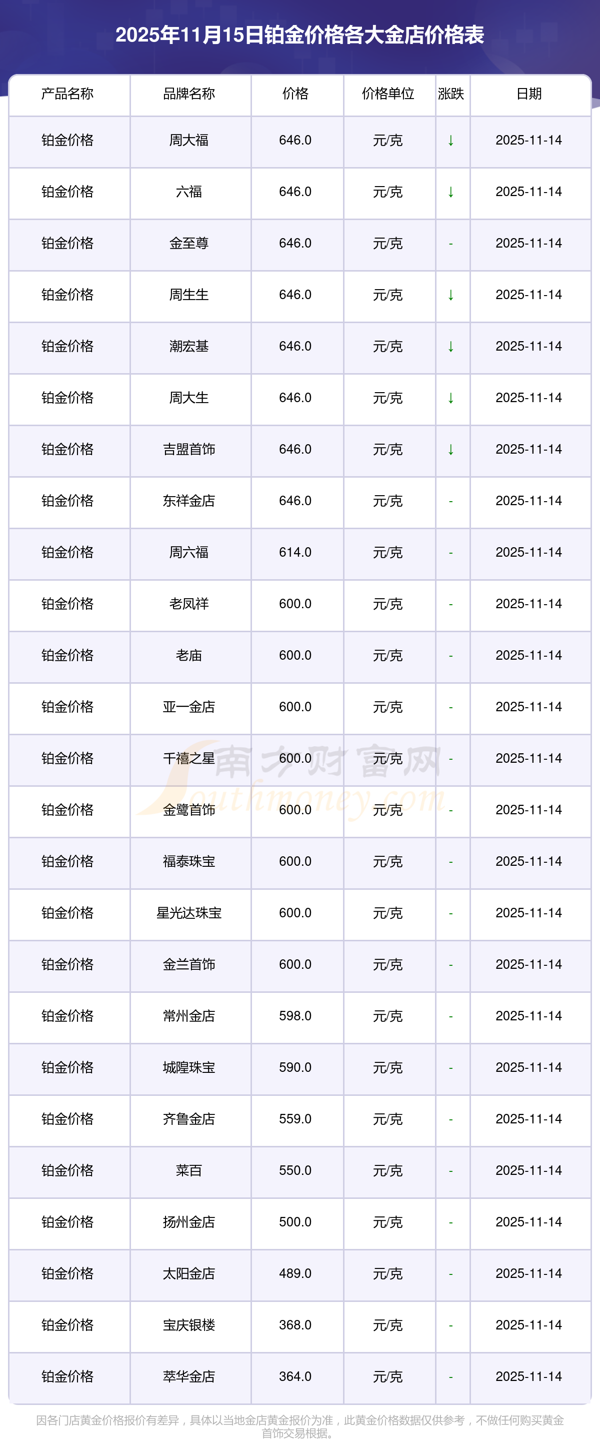 2025年11月15日各大金店铂金价格最新价格:周大福1333.0元/克,周大福646.0元/克,周大福1333.0元/克,周大福46320.0,周大福18410.0,周大福41780.0,周大福1167.0元/克,老凤祥1322.0元/克,老凤祥600.0元/克,老凤祥1322.0元/克,周六福1295.0元/克。