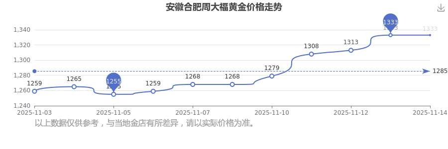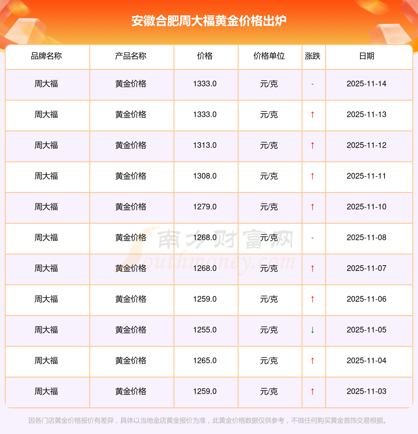 今日安徽合肥周大福黄金价格:1333.0元/克。