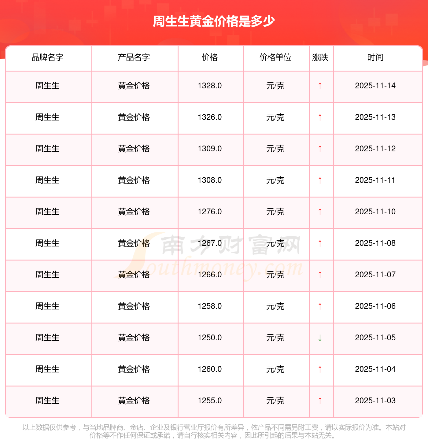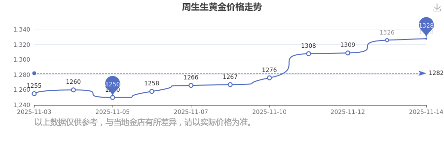 今日黄金价格查询_现在金价黄金一克多少钱,黄金价格是多少钱一克?是优良导电导热材料的黄金,有良好的导热特性。电子工业的特殊电路设计常采用它,因其化学稳定性高、抗氧化性强,能够制作高精度电子元件。今日周生生所公布的 黄金价格最新价格为1328.0元/克。