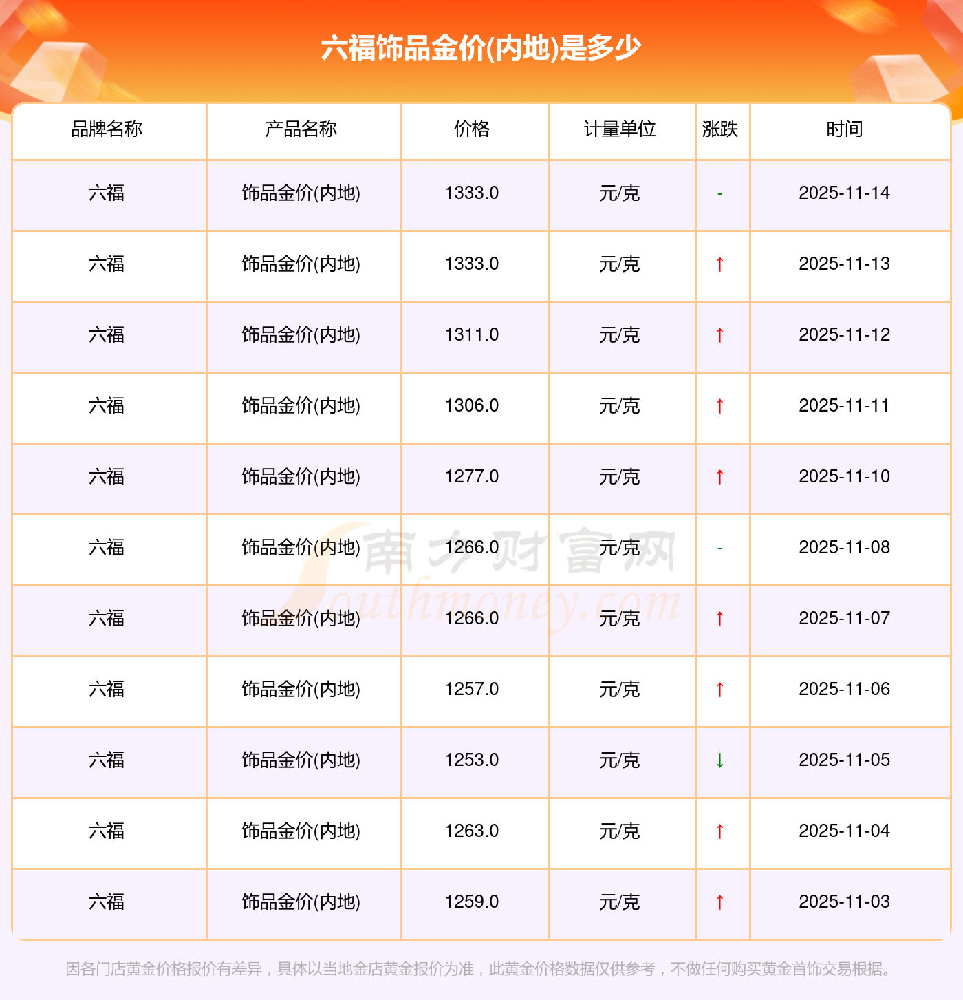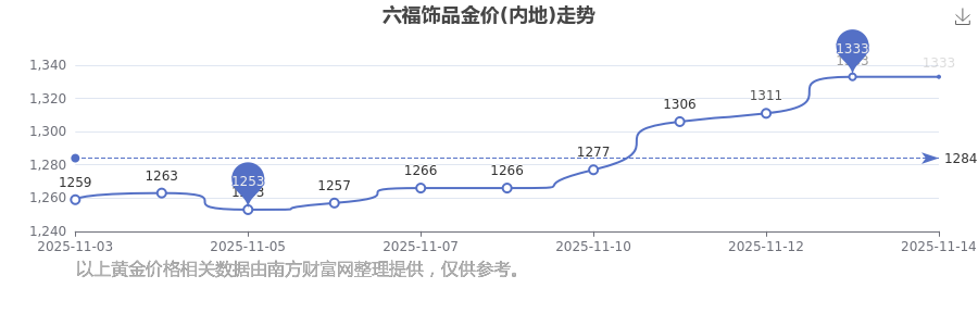 2025年11月15日六福饰品金价(内地)最新是1333.0元/克。