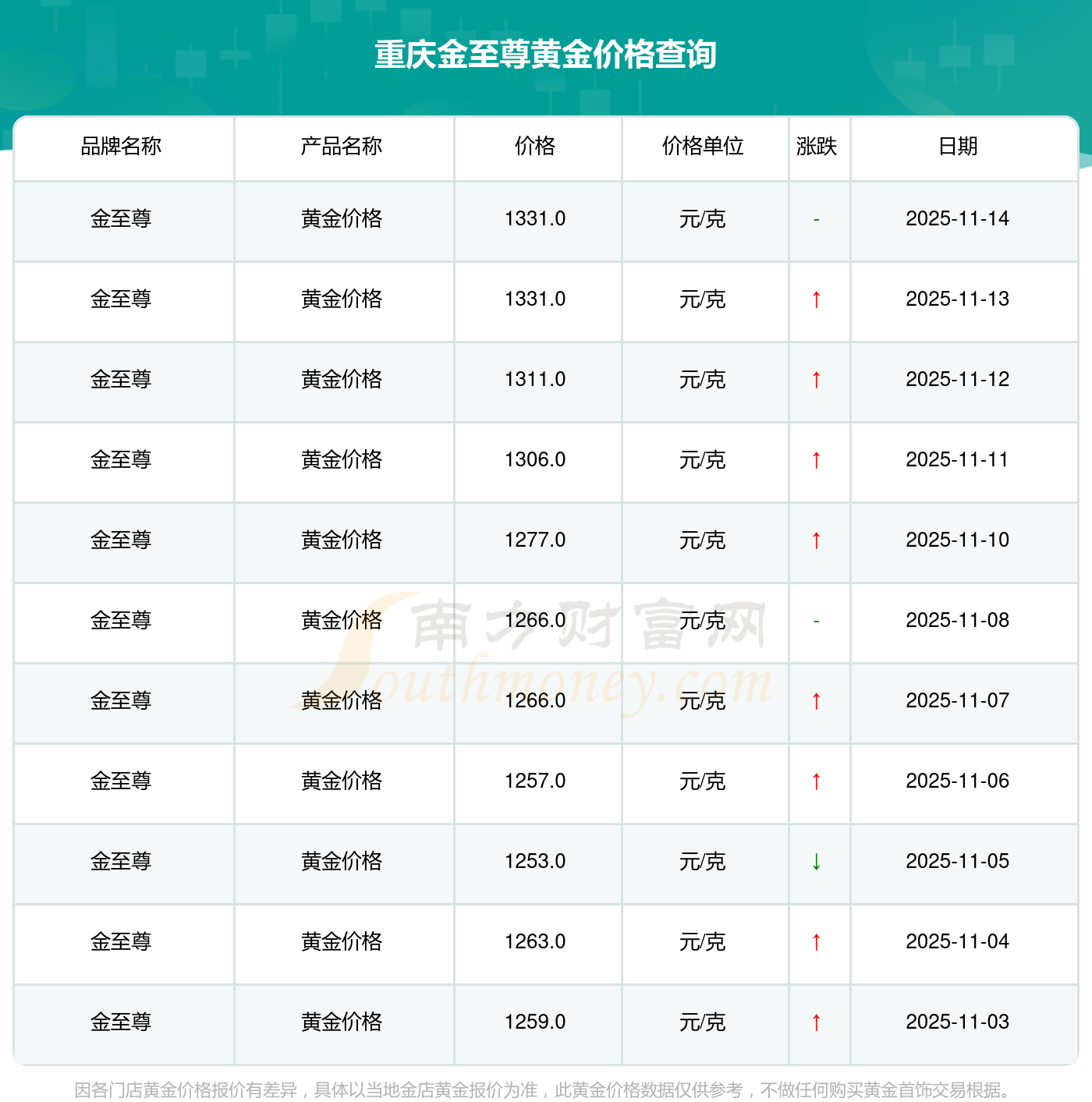 (2025年11月15日)重庆金至尊黄金价格现在为1331.0元/克。