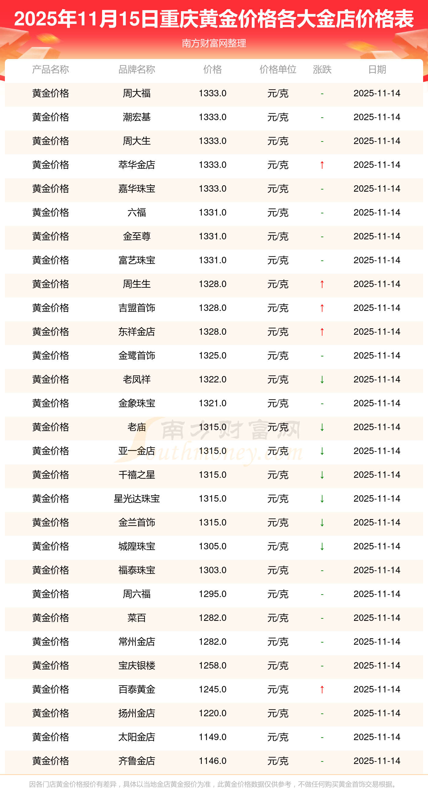今天是2025年11月15日,重庆周大福、周大福、周大福、周大福、周大福、周大福、周大福、老凤祥、老凤祥、老凤祥、周六福等各大金店品牌黄金价格最新价格如下:周大福1333.0元/克、周大福646.0元/克、周大福1333.0元/克、周大福46320.0、周大福18410.0、周大福41780.0、周大福1167.0元/克、老凤祥1322.0元/克、老凤祥600.0元/克、老凤祥1322.0元/克、周六福1295.0元/克。