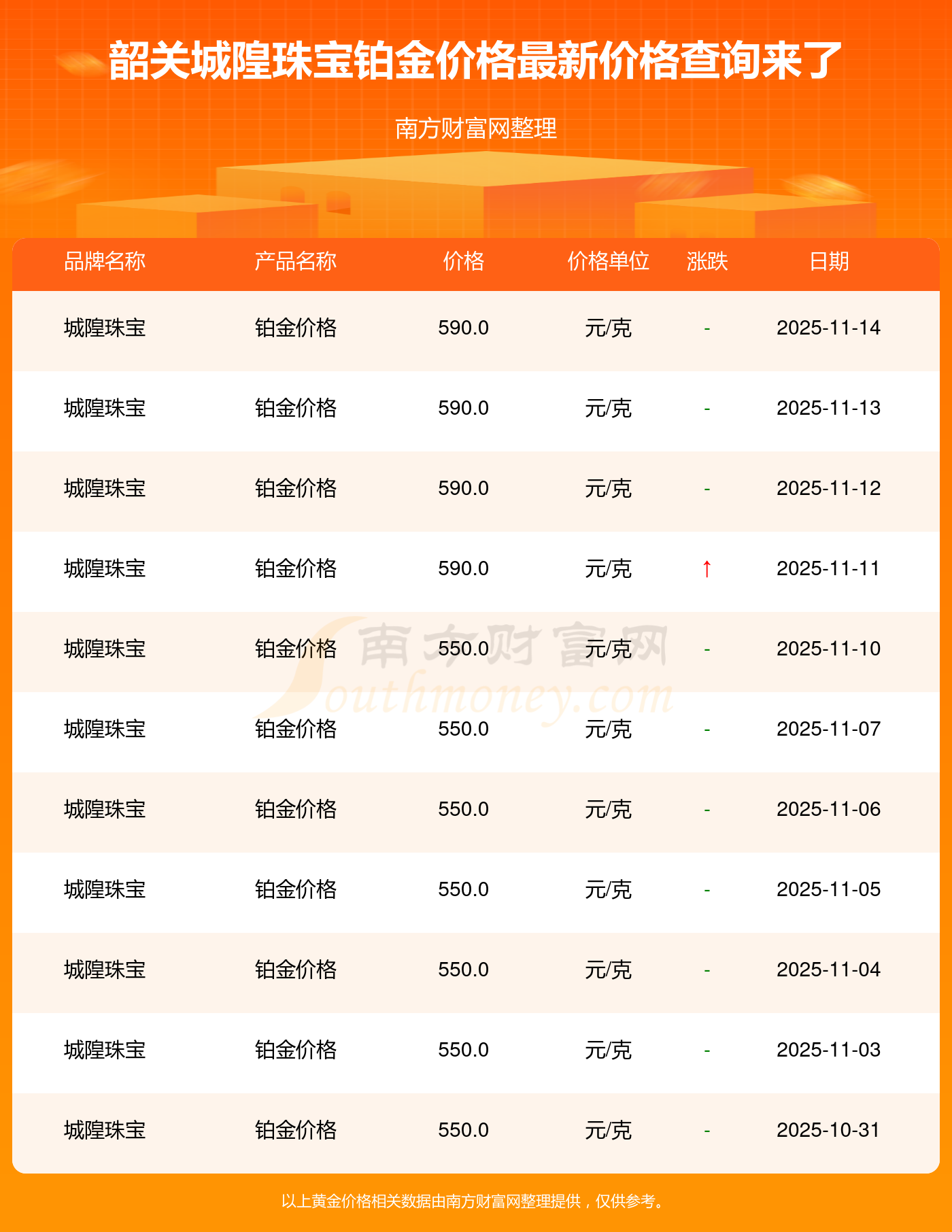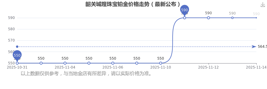 今日(2025年11月15日),韶关城隍珠宝铂金价格:590.0元/克。