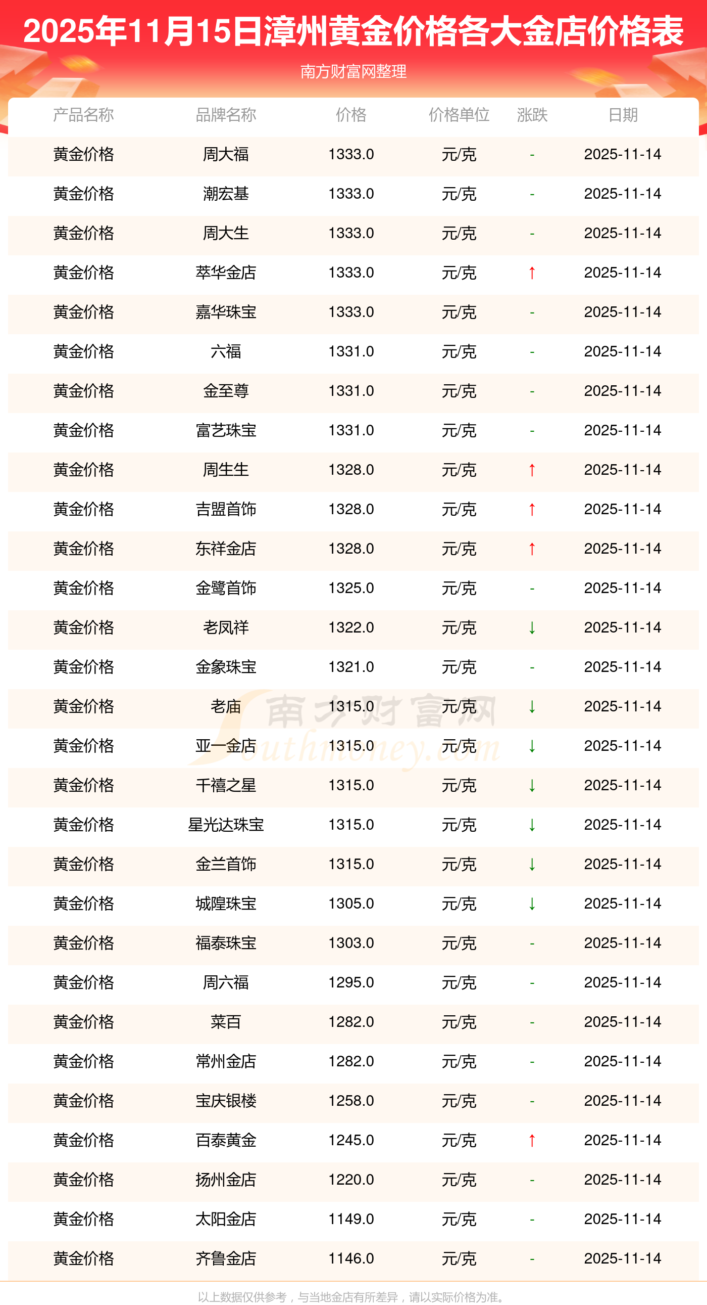 2025年11月15日漳州各大金店黄金价格最新价格:周大福1333.0元/克,周大福646.0元/克,周大福1333.0元/克,周大福46320.0,周大福18410.0,周大福41780.0,周大福1167.0元/克,老凤祥1322.0元/克,老凤祥600.0元/克,老凤祥1322.0元/克,周六福1295.0元/克。