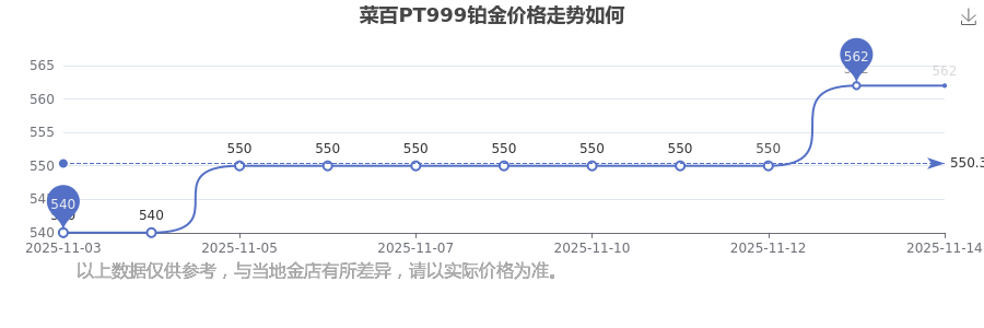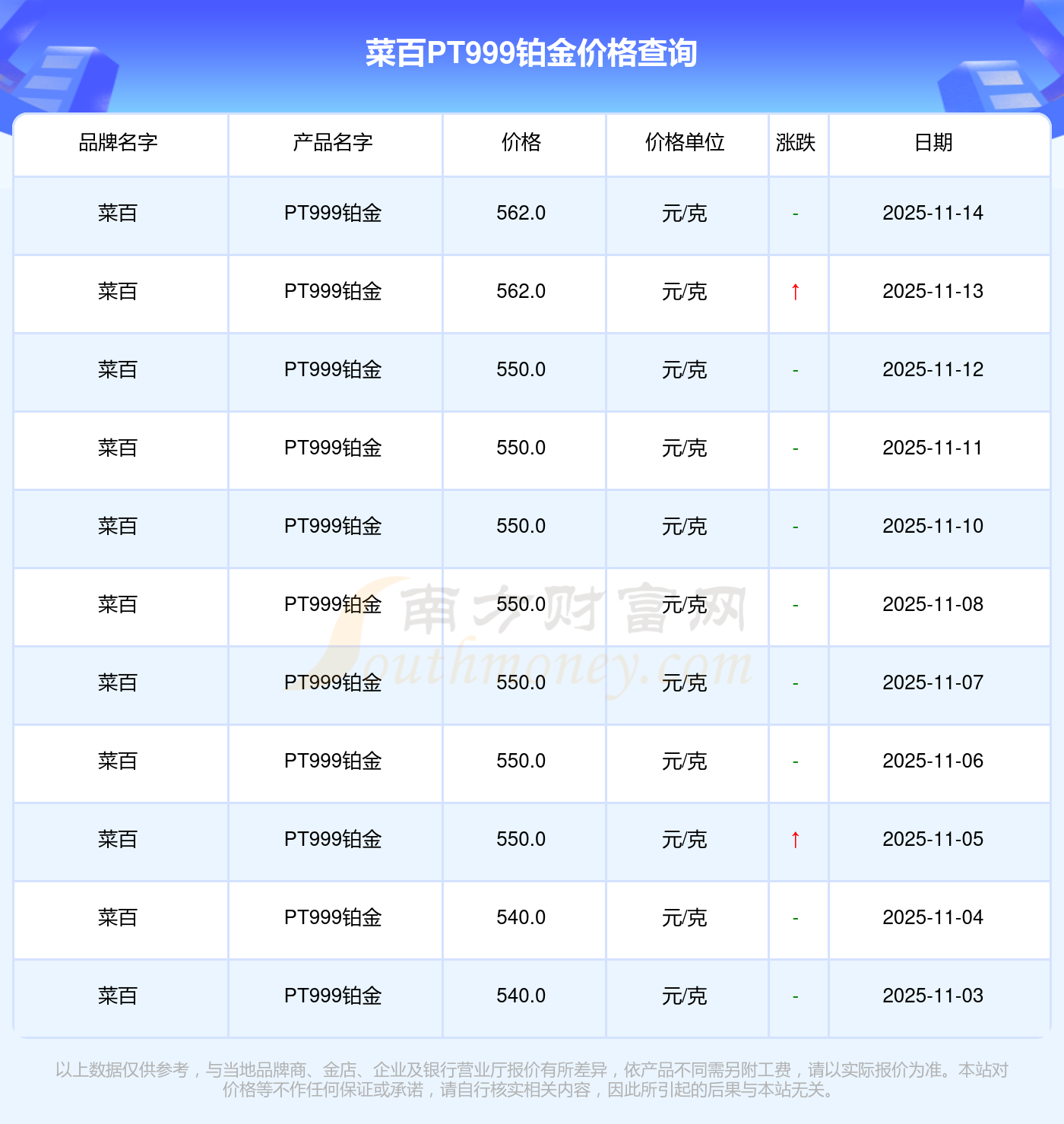 今日菜百 PT999铂金最新的克重售价为562.0元/克。