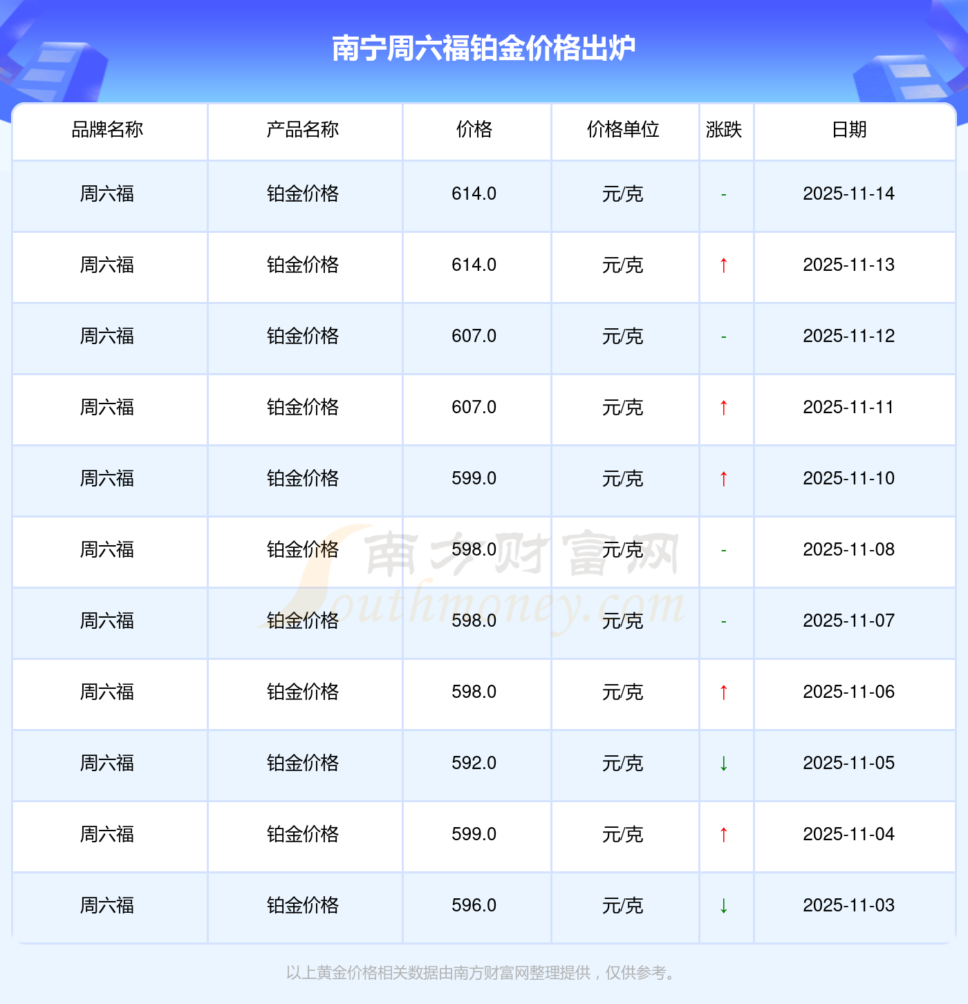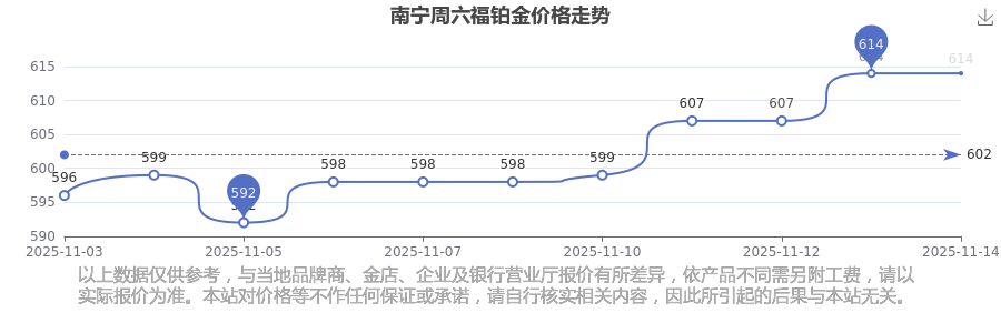 2025年11月15日南宁周六福铂金价格:614.0元/克。