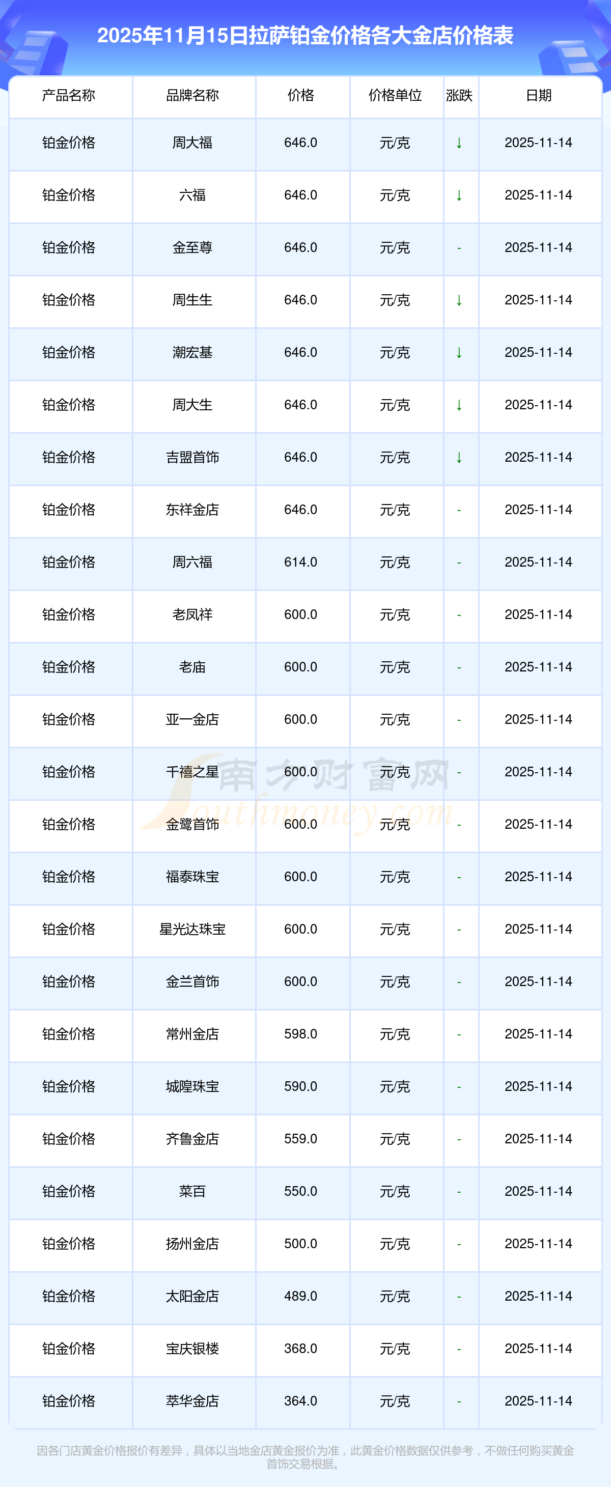2025年11月15日拉萨周大福、周大福、周大福、周大福、周大福、周大福、周大福、老凤祥、老凤祥、老凤祥、周六福等各大金店品牌铂金价格最新价格行情来了,如下:周大福黄金价格1333.0元/克,周大福铂金价格646.0元/克,周大福饰品金价(内地)1333.0元/克,周大福黄金饰品(香港)46320.0,周大福铂金价格(香港)18410.0,周大福金条价格(香港)41780.0,周大福金条金价(内地)1167.0元/克,老凤祥黄金价格1322.0元/克,老凤祥铂金价格600.0元/克,老凤祥足金价格1322.0元/克,周六福黄金价格1295.0元/克。