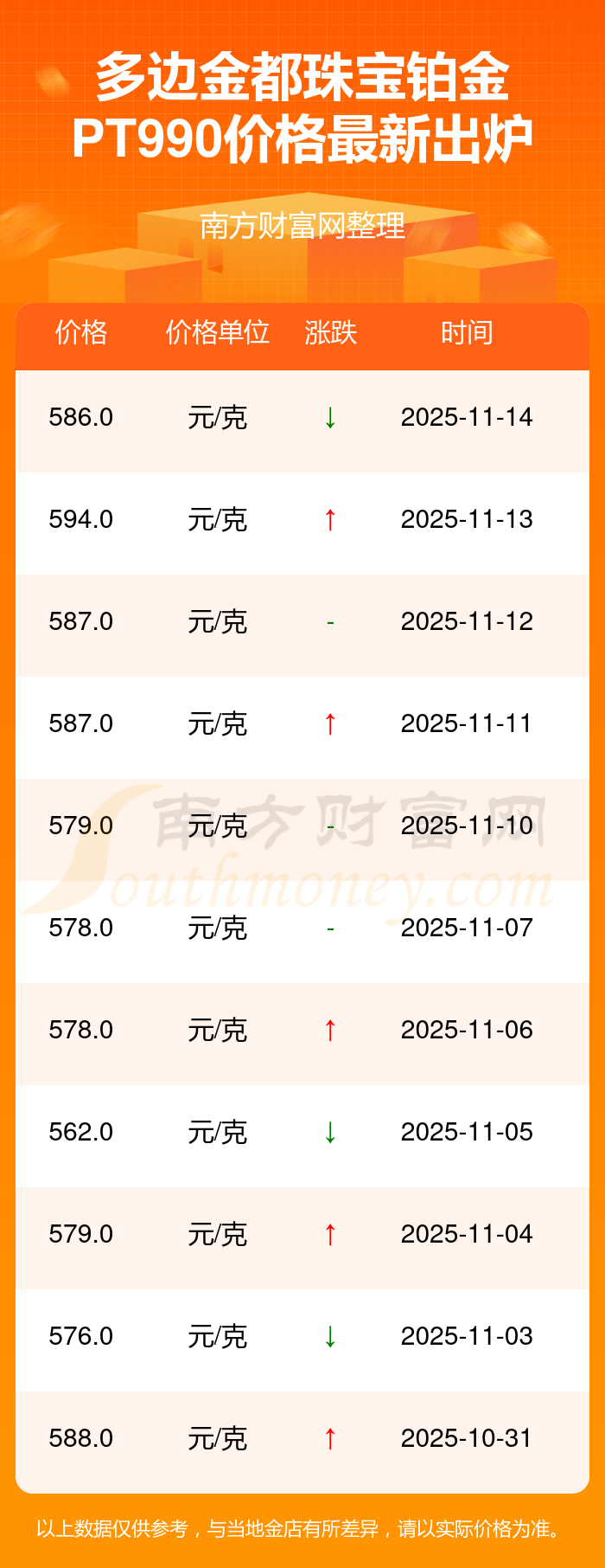 今日(2025年11月15日)多边金都珠宝铂金PT990的价格为586.0元/克。
