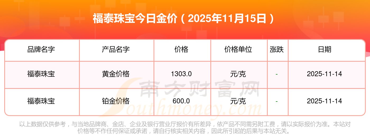 2025年11月15日周大福、周大福、周大福、周大福、周大福、周大福、周大福、老凤祥、老凤祥、老凤祥、周六福等各大金店品牌黄金价格最新价格如下:周大福黄金价格1333.0元/克,周大福铂金价格646.0元/克,周大福饰品金价(内地)1333.0元/克,周大福黄金饰品(香港)46320.0,周大福铂金价格(香港)18410.0,周大福金条价格(香港)41780.0,周大福金条金价(内地)1167.0元/克,老凤祥黄金价格1322.0元/克,老凤祥铂金价格600.0元/克,老凤祥足金价格1322.0元/克,周六福黄金价格1295.0元/克。
