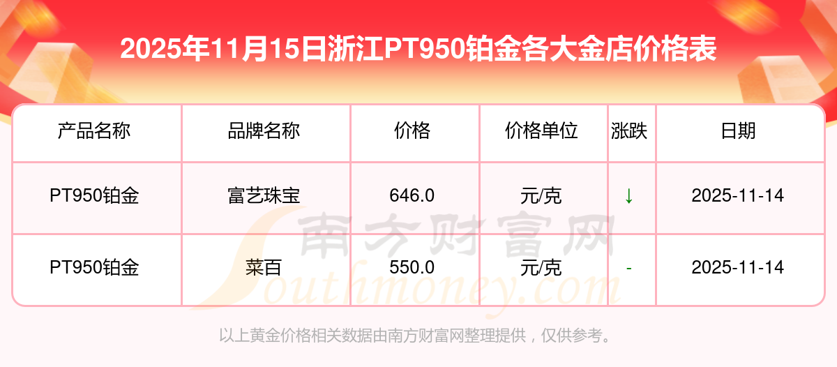 2025年11月15日浙江周大福、周大福、周大福、周大福、周大福、周大福、周大福、老凤祥、老凤祥、老凤祥、周六福等各大金店品牌PT950铂金最新价格如下:周大福黄金价格1333.0元/克,周大福铂金价格646.0元/克,周大福饰品金价(内地)1333.0元/克,周大福黄金饰品(香港)46320.0,周大福铂金价格(香港)18410.0,周大福金条价格(香港)41780.0,周大福金条金价(内地)1167.0元/克,老凤祥黄金价格1322.0元/克,老凤祥铂金价格600.0元/克,老凤祥足金价格1322.0元/克,周六福黄金价格1295.0元/克。