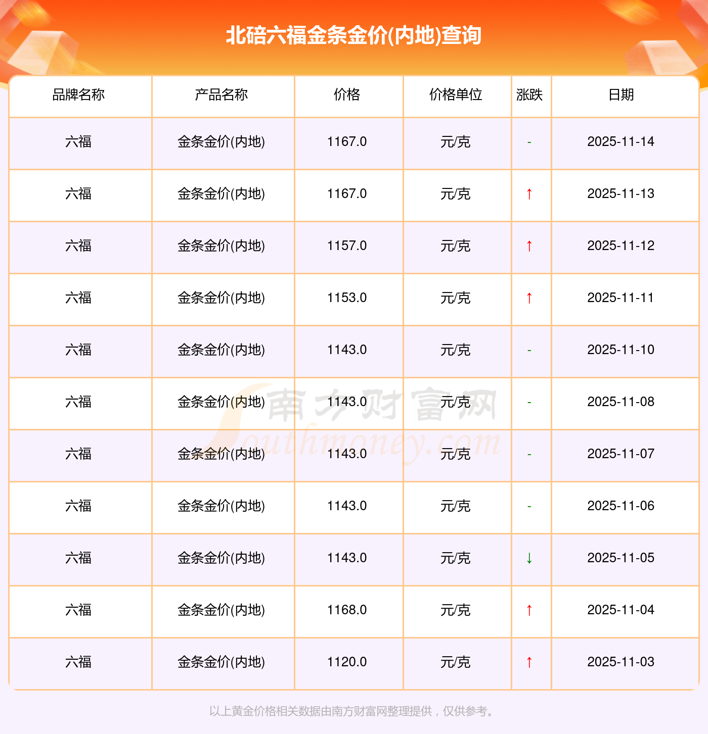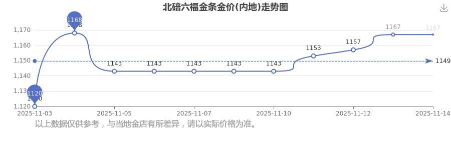 2025年11月15日,北碚六福所售金条金价(内地),其价格设定为 1167.0元/克。