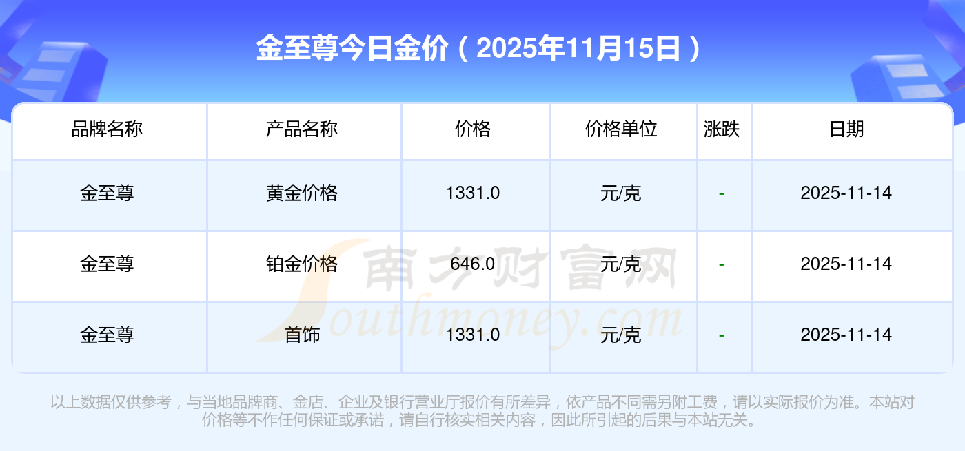 2025年11月15日金至尊最新价格:黄金价格1333.0元/克,铂金价格646.0元/克,饰品金价(内地)1333.0元/克,黄金饰品(香港)46320.0,铂金价格(香港)18410.0,金条价格(香港)41780.0,金条金价(内地)1167.0元/克,黄金价格1322.0元/克,铂金价格600.0元/克,足金价格1322.0元/克,黄金价格1295.0元/克。