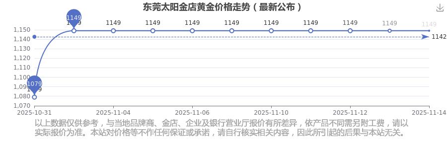 东莞太阳金店黄金价格在 2025年11月15日为 1149.0元/克。