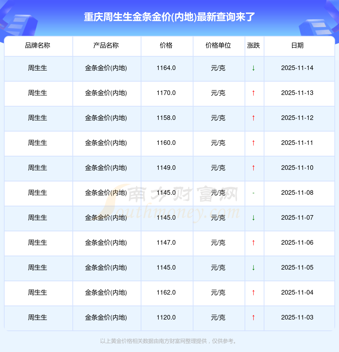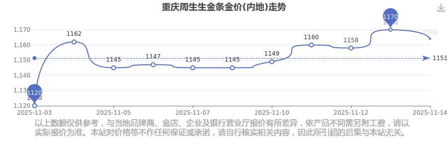 2025年11月15日重庆周生生金条金价(内地):1164.0元/克。