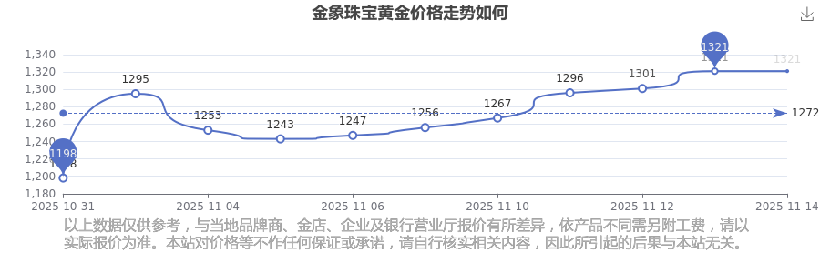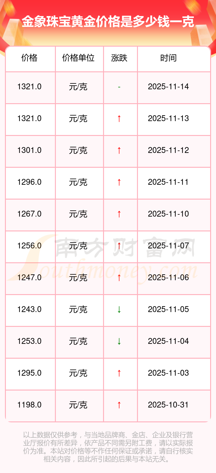 今日黄金价格查询_现在金价黄金一克多少钱,黄金价格是多少钱一克?黄金每克的价格大概是多少范围?当下,金象珠宝 黄金价格今日的最新价格是1321.0元/克。