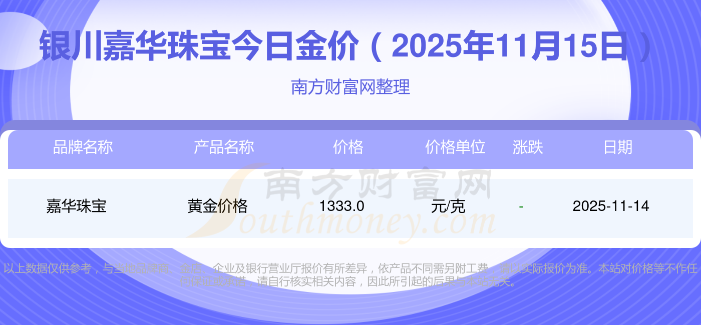 2025年11月15日银川嘉华珠宝今日价格:黄金价格1333.0元/克,铂金价格646.0元/克,饰品金价(内地)1333.0元/克,黄金饰品(香港)46320.0,铂金价格(香港)18410.0,金条价格(香港)41780.0,金条金价(内地)1167.0元/克,黄金价格1322.0元/克,铂金价格600.0元/克,足金价格1322.0元/克,黄金价格1295.0元/克。