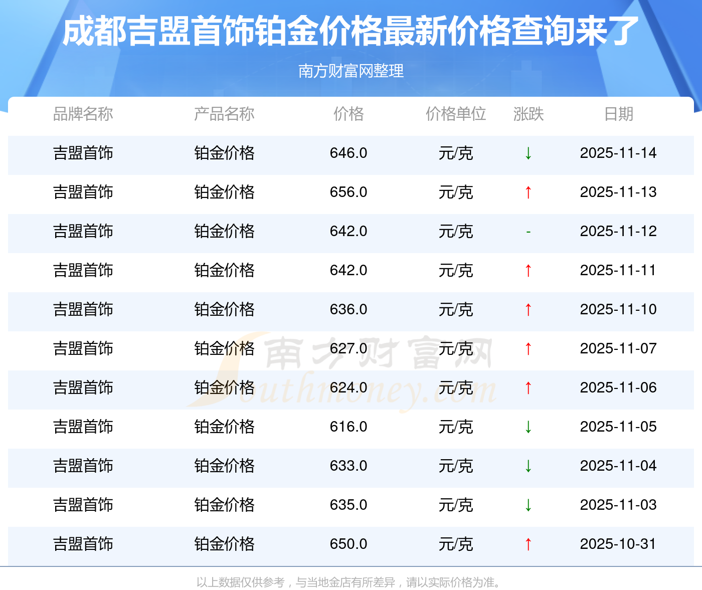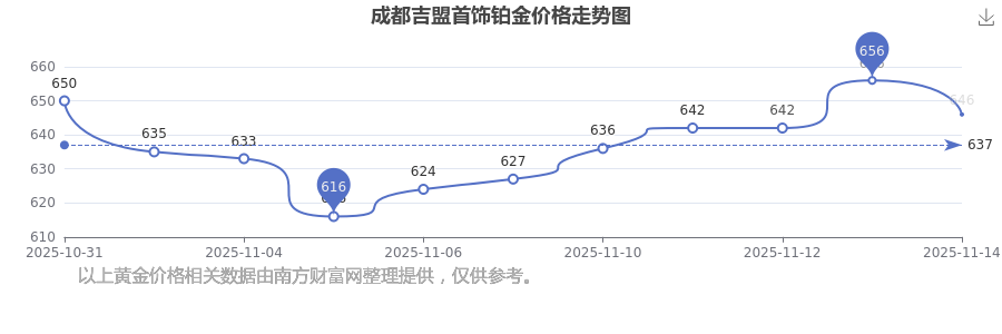 今日(2025年11月15日)成都吉盟首饰铂金价格为646.0元/克。