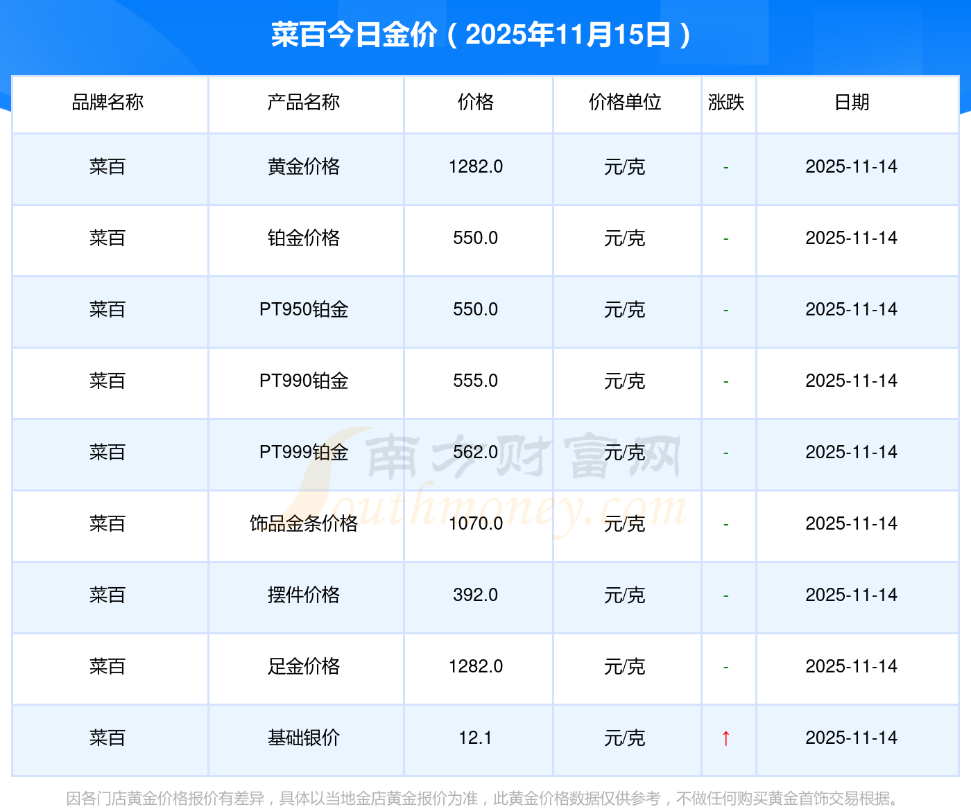 2025年11月15日济南菜百黄金一克的市场行情价是多少?黄金价格1333.0元/克,铂金价格646.0元/克,饰品金价(内地)1333.0元/克,黄金饰品(香港)46320.0,铂金价格(香港)18410.0,金条价格(香港)41780.0,金条金价(内地)1167.0元/克,黄金价格1322.0元/克,铂金价格600.0元/克,足金价格1322.0元/克,黄金价格1295.0元/克。