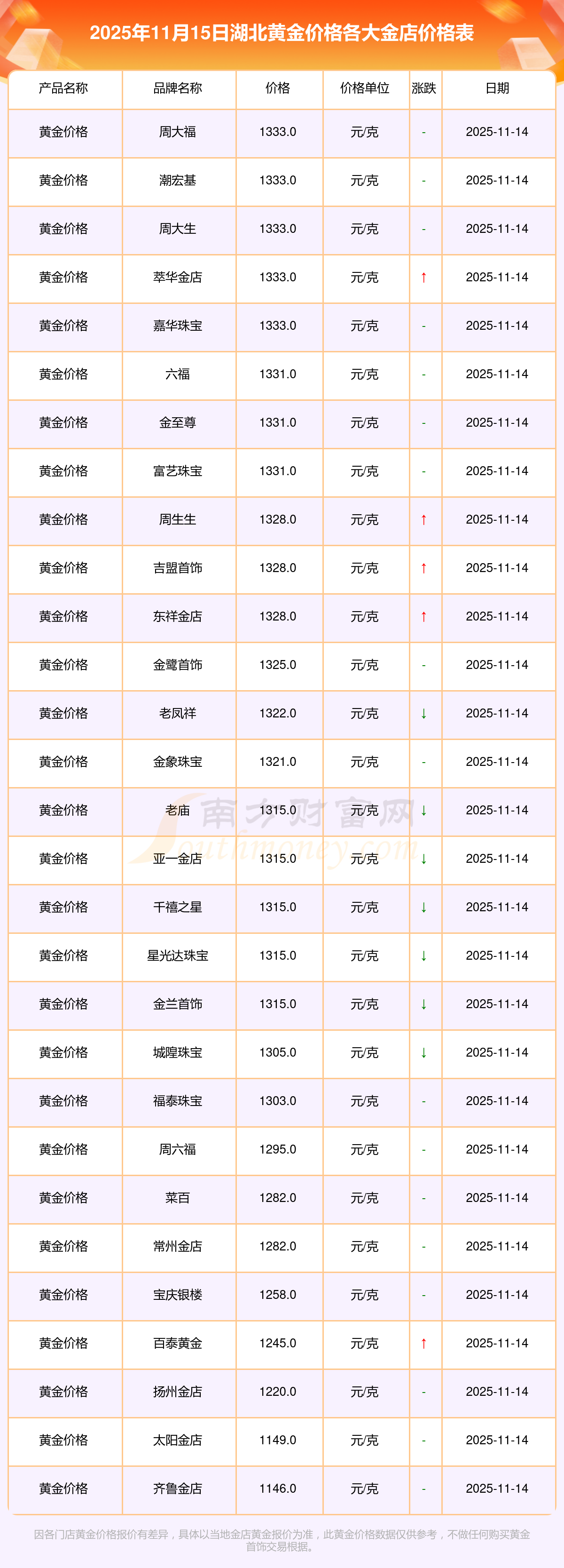 2025年11月15日湖北周大福、周大福、周大福、周大福、周大福、周大福、周大福、老凤祥、老凤祥、老凤祥、周六福等各大金店品牌黄金价格最新价格行情来了,如下:周大福黄金价格1333.0元/克,周大福铂金价格646.0元/克,周大福饰品金价(内地)1333.0元/克,周大福黄金饰品(香港)46320.0,周大福铂金价格(香港)18410.0,周大福金条价格(香港)41780.0,周大福金条金价(内地)1167.0元/克,老凤祥黄金价格1322.0元/克,老凤祥铂金价格600.0元/克,老凤祥足金价格1322.0元/克,周六福黄金价格1295.0元/克。