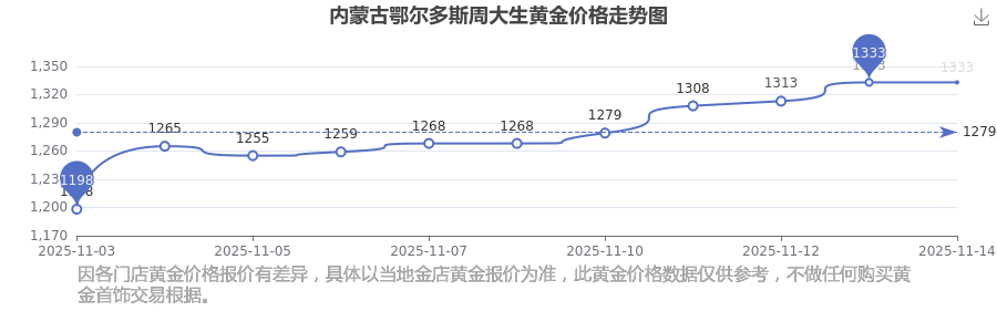 1333.0元/克,这是内蒙古鄂尔多斯周大生于 2025年11月15日所定的黄金价格。
