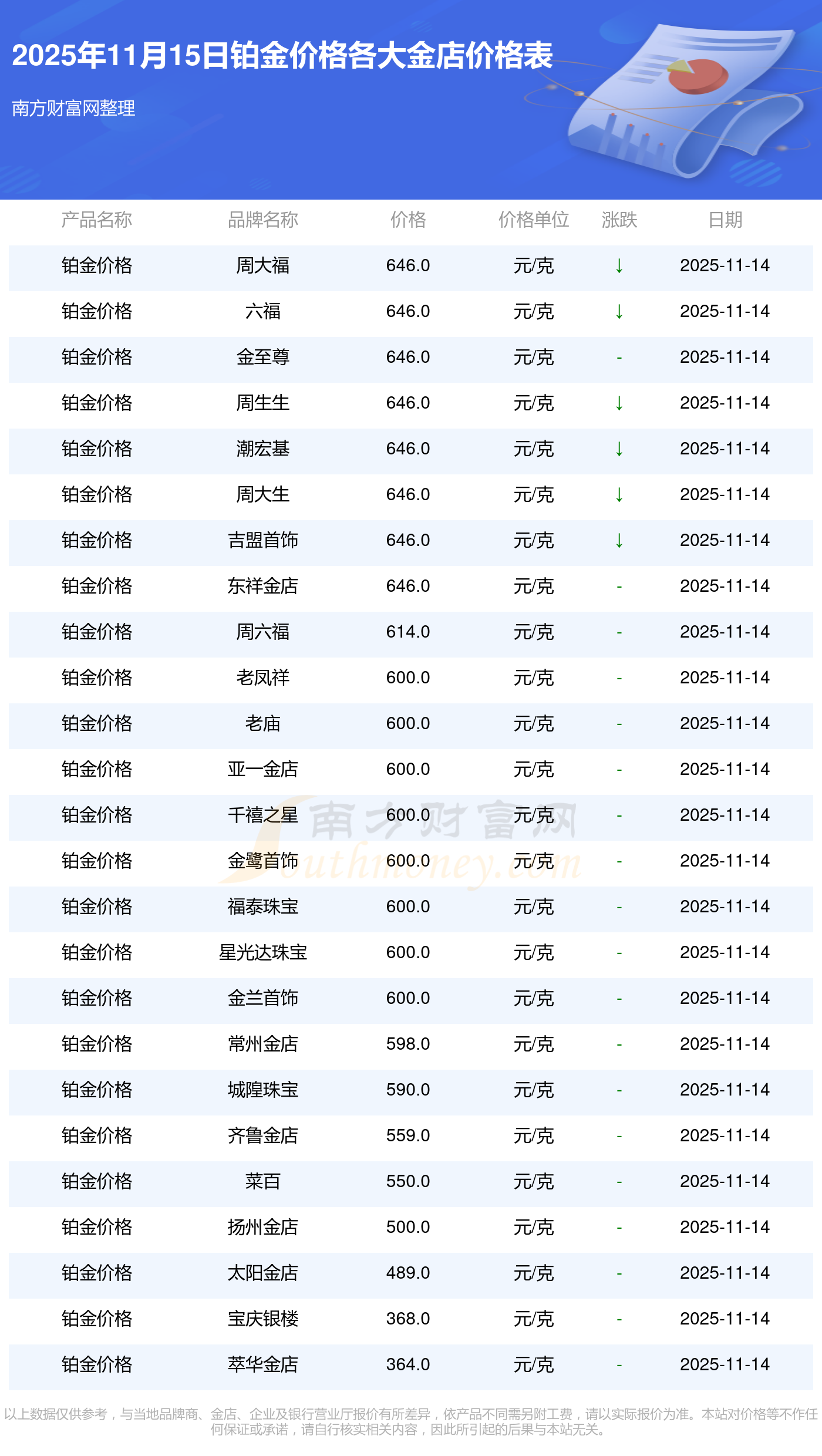 今天是2025年11月15日,周大福、周大福、周大福、周大福、周大福、周大福、周大福、老凤祥、老凤祥、老凤祥、周六福等各大金店品牌铂金价格最新价格如下:周大福1333.0元/克、周大福646.0元/克、周大福1333.0元/克、周大福46320.0、周大福18410.0、周大福41780.0、周大福1167.0元/克、老凤祥1322.0元/克、老凤祥600.0元/克、老凤祥1322.0元/克、周六福1295.0元/克。