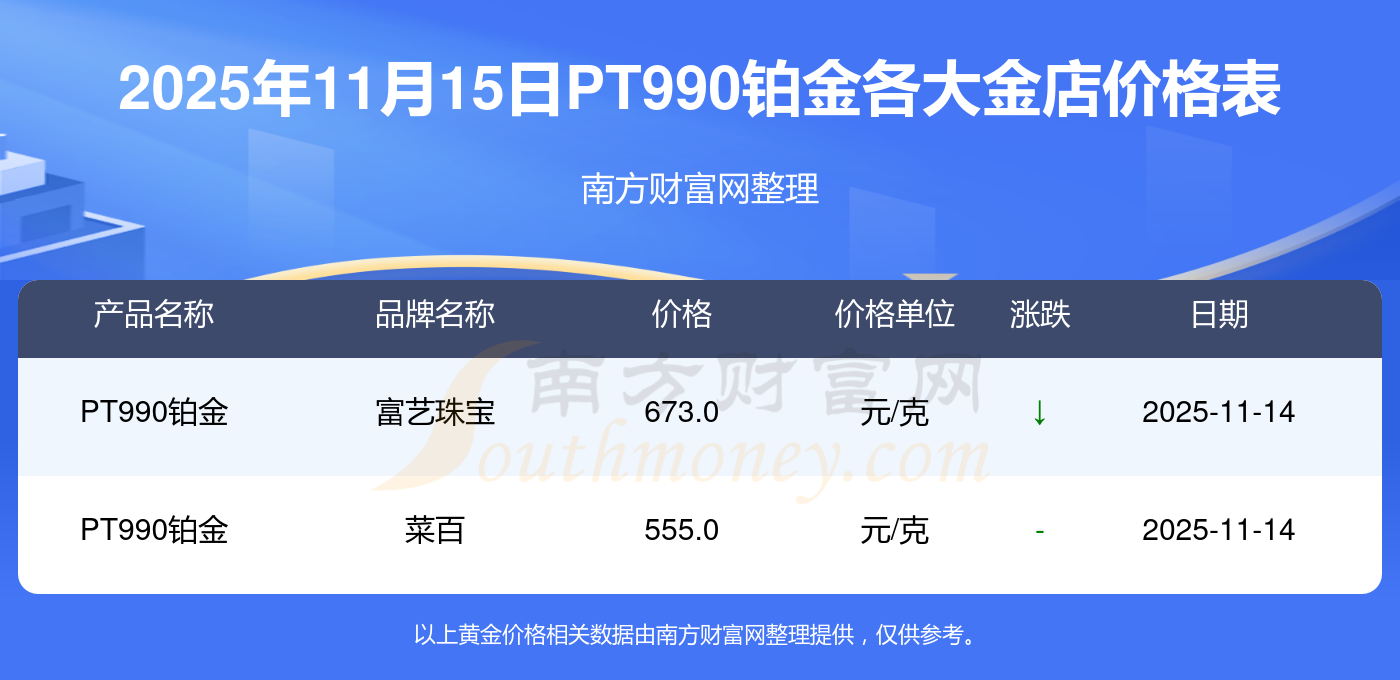 2025年11月15日周大福、周大福、周大福、周大福、周大福、周大福、周大福、老凤祥、老凤祥、老凤祥、周六福等各大金店品牌PT990铂金最新价格如下:周大福黄金价格1333.0元/克,周大福铂金价格646.0元/克,周大福饰品金价(内地)1333.0元/克,周大福黄金饰品(香港)46320.0,周大福铂金价格(香港)18410.0,周大福金条价格(香港)41780.0,周大福金条金价(内地)1167.0元/克,老凤祥黄金价格1322.0元/克,老凤祥铂金价格600.0元/克,老凤祥足金价格1322.0元/克,周六福黄金价格1295.0元/克。