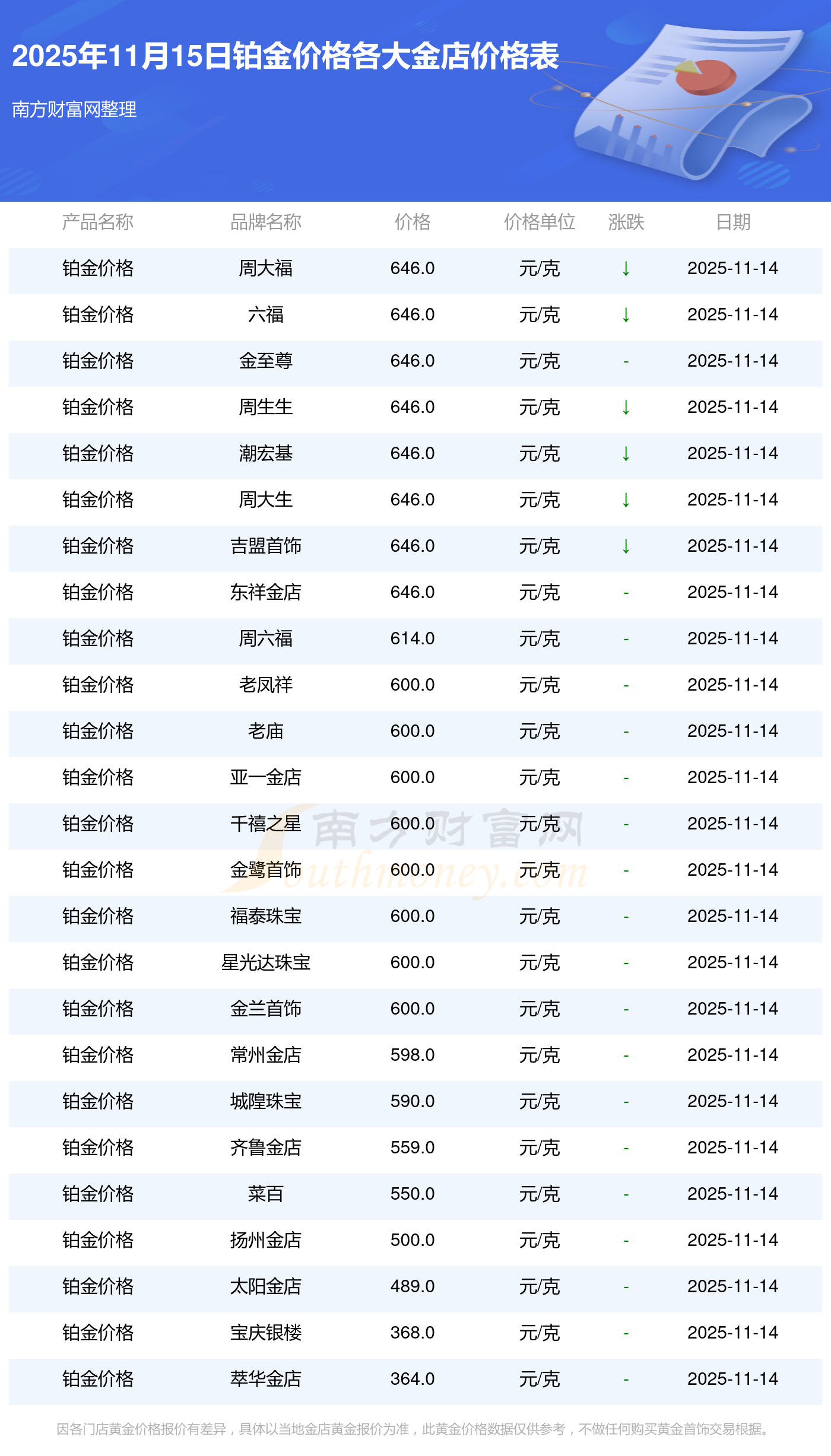 2025年11月15日各大金店铂金价格最新价格:周大福1333.0元/克,周大福646.0元/克,周大福1333.0元/克,周大福46320.0,周大福18410.0,周大福41780.0,周大福1167.0元/克,老凤祥1322.0元/克,老凤祥600.0元/克,老凤祥1322.0元/克,周六福1295.0元/克。